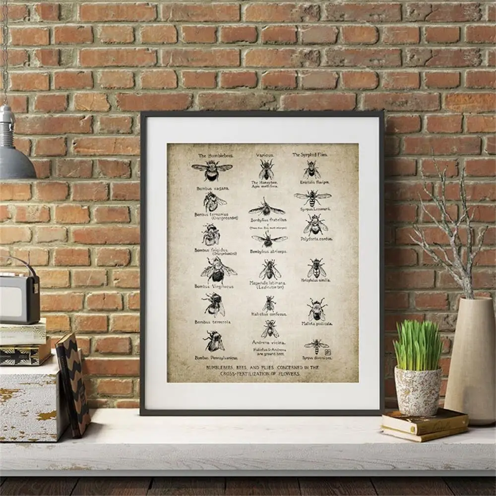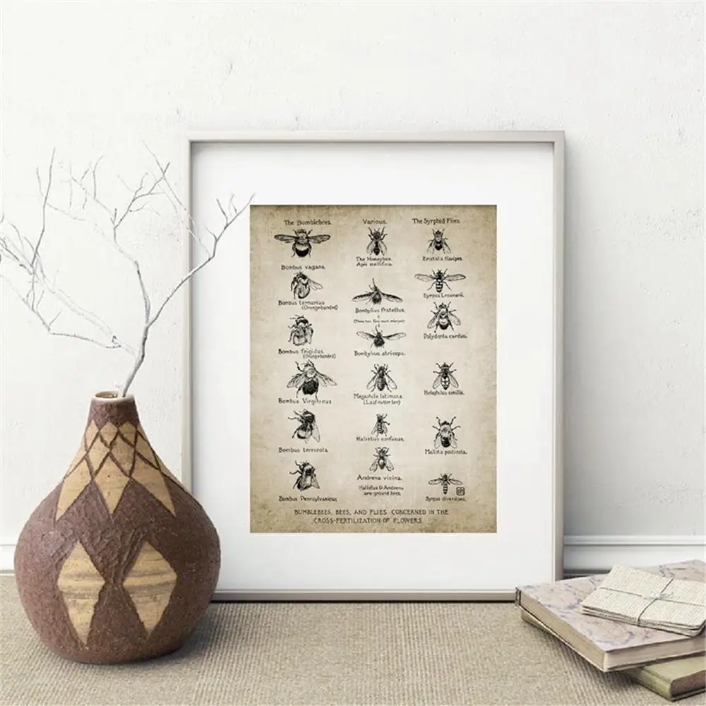 ВИНТАЖНЫЙ ПЛАКАТ с пчелами, шмбель, мухи, иллюстрация насекомых, энтомология, настенное искусство, холст, живопись, образование, наука, Настенный декор