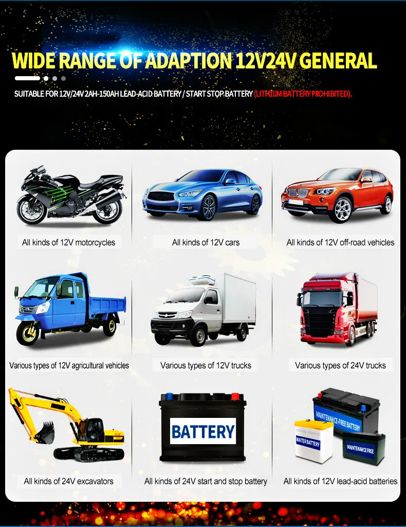 • Типы батарей: большинство типов свинцово-кислотных батарей, включая кальций, гель и AGM, влажные, EFB и т. Д.