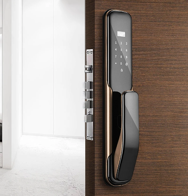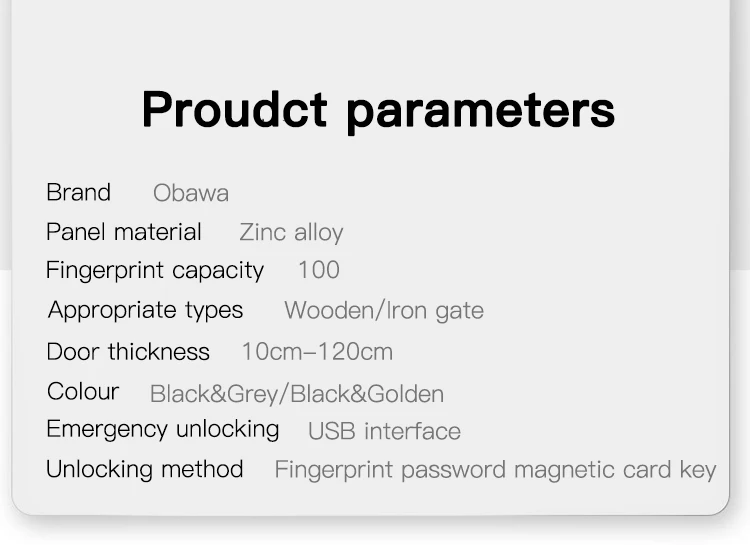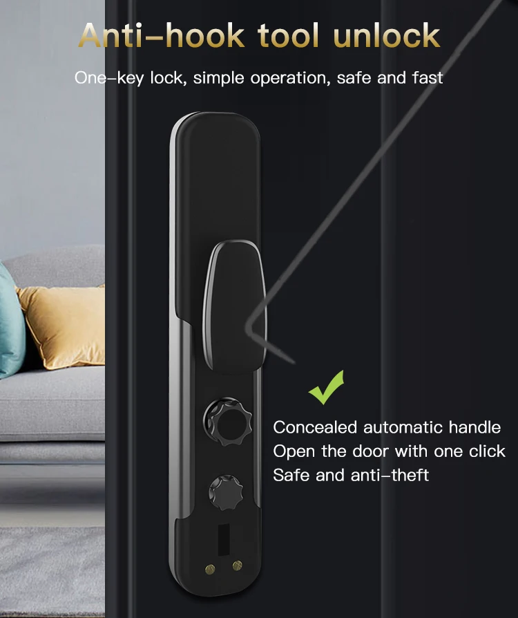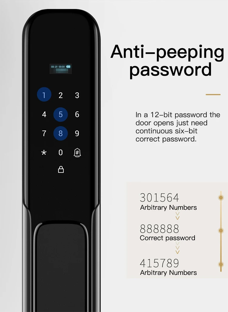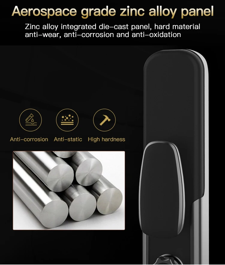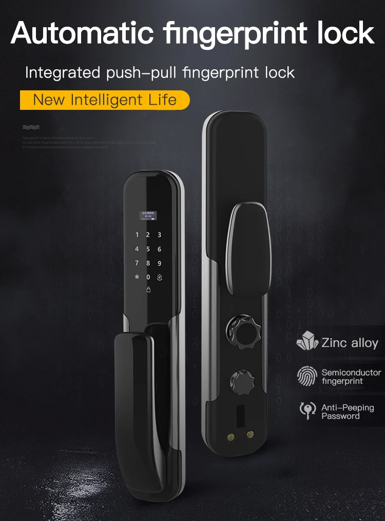 Это автоматический интеллектуальный замок. Подходит для металлических дверей, деревянных дверей и других дверей. Панель из цинкового сплава + цилиндр с медным замком, трудно разрушить в результате применения силы. Новый встроенного модуля отпечатков пальцев Полупроводника, определение отпечатка пальца Модернизированный модуль сканирования отпечатка пальцев Повышенная безопасность Более высокая скорость распознавания Длительный срок службы 6-значный цифровой пароль Поддержка защиты от подглядывания, вы можете добавить любой номер до и после правильного пароля. Временный пароль можно получить удаленно, используя мобильный телефон, который подходит для посетителей или неполный рабочий день. Поддержка разблокировки карты IC, если вы случайно потеряете карту, не забудьте удалить ее информацию, поэтому она не будет использоваться для разблокировки. С двумя ключами, вы можете держать его в безопасном месте. Встроенная перезаряжаемая литиевая батарея, вам не нужно покупать батарею АА. Внутренняя Панель оснащена кнопками быстрого открытия и закрытия, которые могут автоматически разблокировать/заблокировать нажатием кнопки. В то же время внутренняя панель оснащена ручной ручкой для экстренного использования.