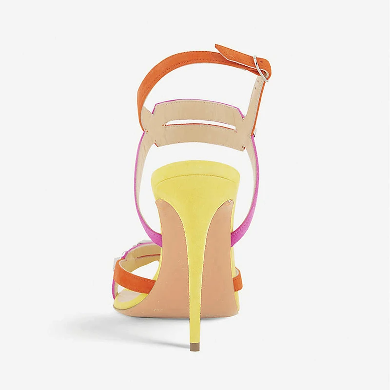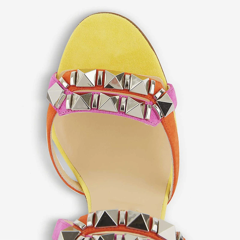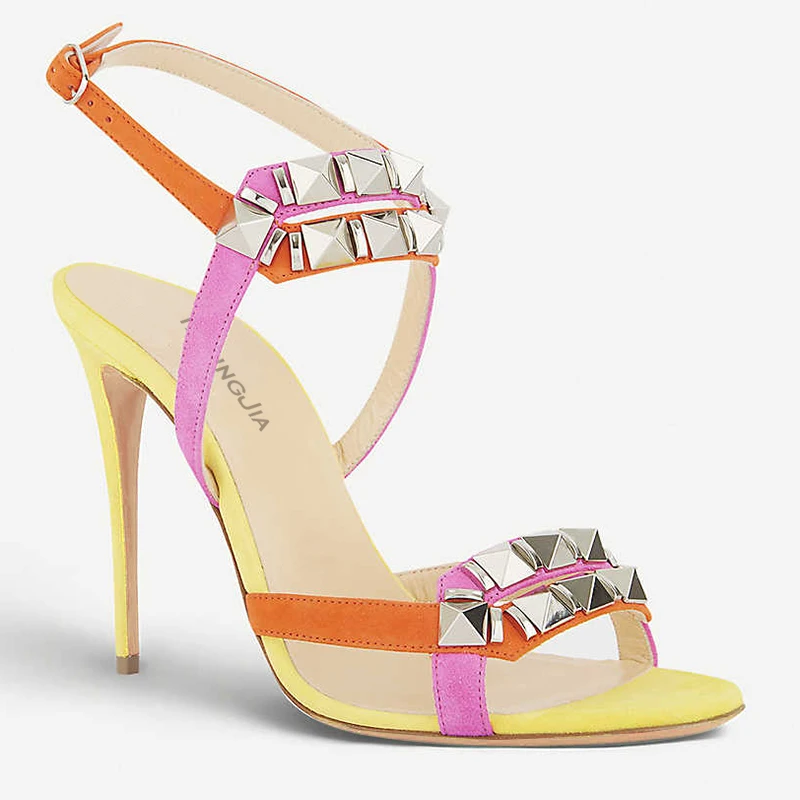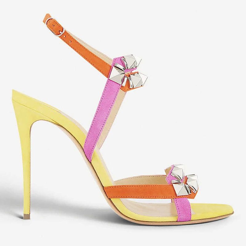 Женские вечерние сандалии из искусственной замши на высоком каблуке; Разноцветные элегантные летние туфли с заклепками; Женские туфли на шпильке; Большие размеры; 2020