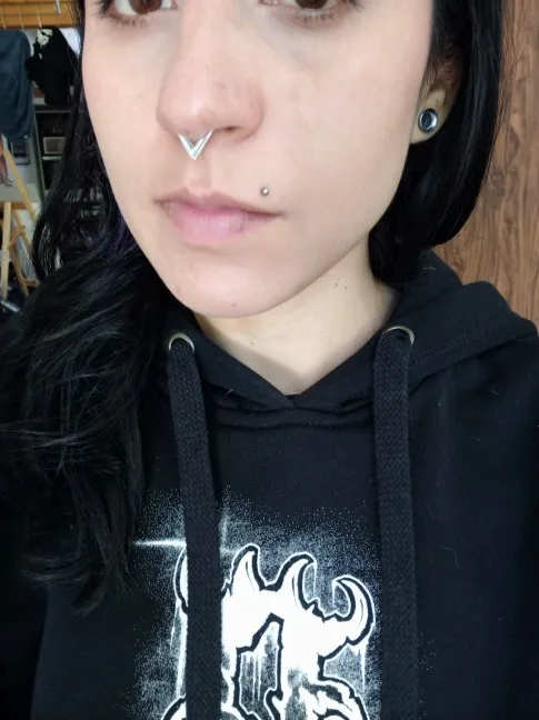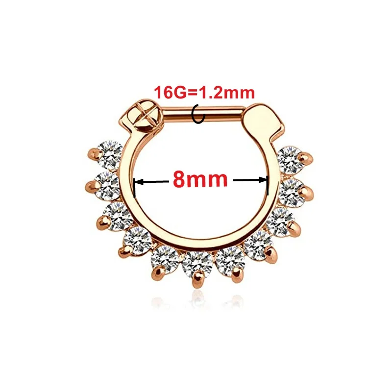 bellissimo, solido, stupendo. un consiglio per chi mette l'anello da 8 mm: per chi ha il buco al setto alto come il mio, questo gioiello potrebbe stringere ai lati, in quanto scende subito in diagonale stringendo verso il centro e resta alto.