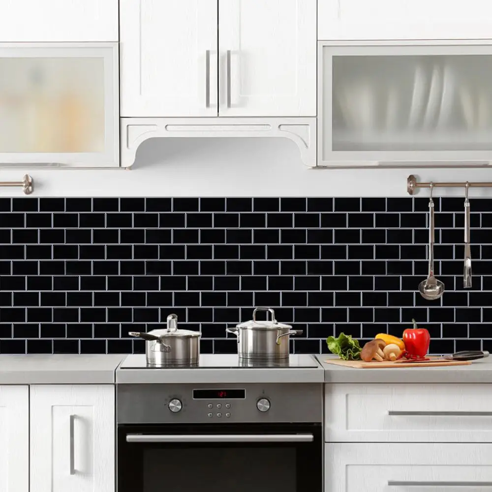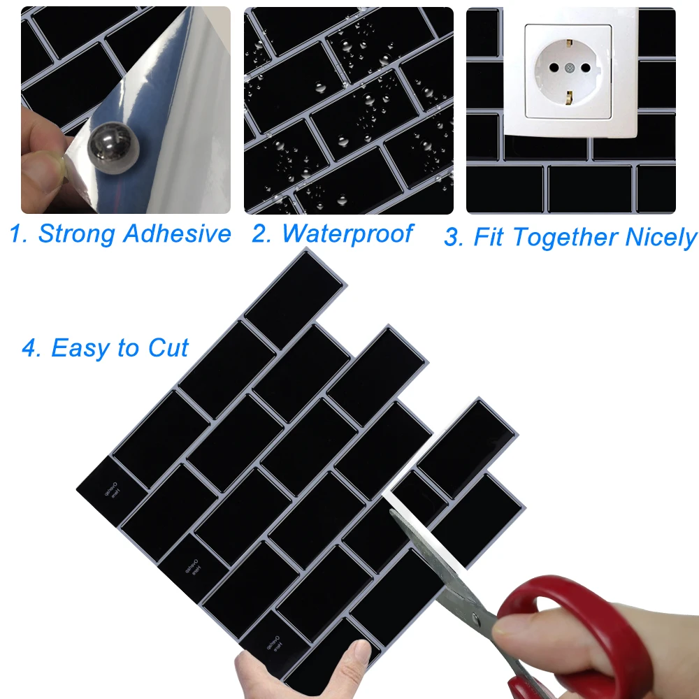 Особенности и преимущества 1: эффект 3D, практически не отличается от реальной плитки 2: Простота установки, обслуживания и очистки 3: устойчив к пятнам, выцветанию, влаге и плесени 4: без затирки, без клея, без специального инструмента и беспорядка. Его можно установить в течение нескольких минут на чистую, сухую, ровную и гладкую поверхность. 5: плотно приклеивается и не выключается