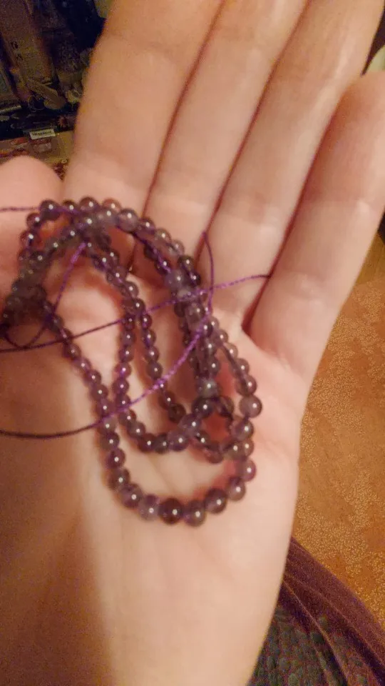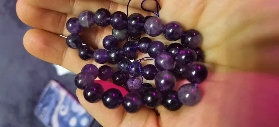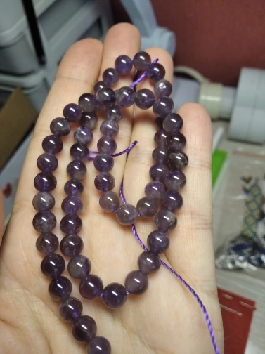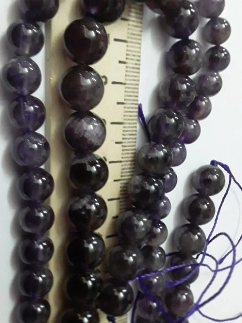 Товар дошел за почти месяц. Камень тяжелый, холодный. Но я как открыла посылку - подумала, что бусы грязные ( в пыли)... Нет, оказалось это камень такой. Я не специалист, в камнях ( в их подлиности ) не разбераюсь, но очень не красивый у них вид ( даже если это настоящий аметист). Это касается только размера 10 мм. Я брала так же 6 и 4 мм - бусинки получше. (хотя цветавая гамма тоже не устойчивая. Сиреневого цвета мало присутствует). Честно. 4 поставила из уважения к продовцу,но попробую взять у другого продавца аметист и сравню. У меня были уже бусы из аметиста, но высокого класса и цветовая гамма резко отличается от этих...