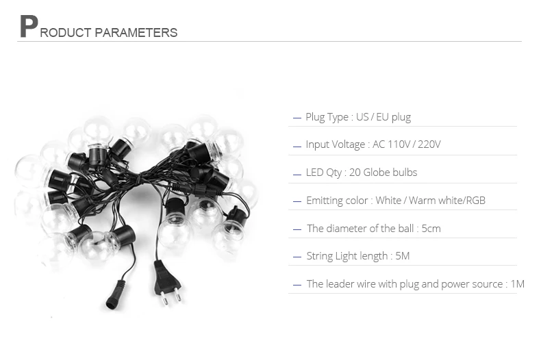 Входное напряжение: AC220V (штепсельная вилка ЕС) AC110V (штепсельная вилка США)Длина: 2,5 M/5MКоличество ламп: 10 шт/20 штВодонепроницаемость: IP65Абажур: молочный/прозрачныйСрок службы лампы: 30000 часовЦвет излучения: белый/теплый белый/сменныйЦветовая температура: 2800k-3500k (теплый белый); 6000k-6500k (белый)Материал изделия: медь и ПВХТип штепсельной вилки: штепсельная вилка европейского стандарта или штепсельная вилка американского стандартаПодключение до макс. 15 нитей (100 м)