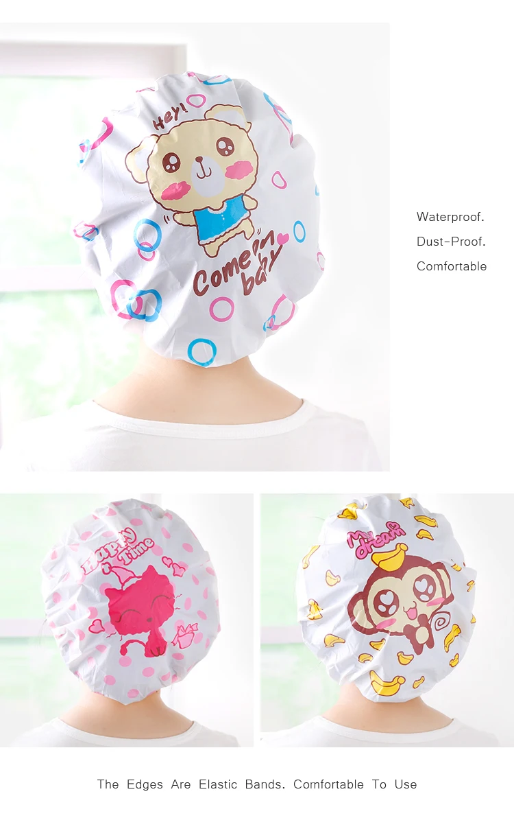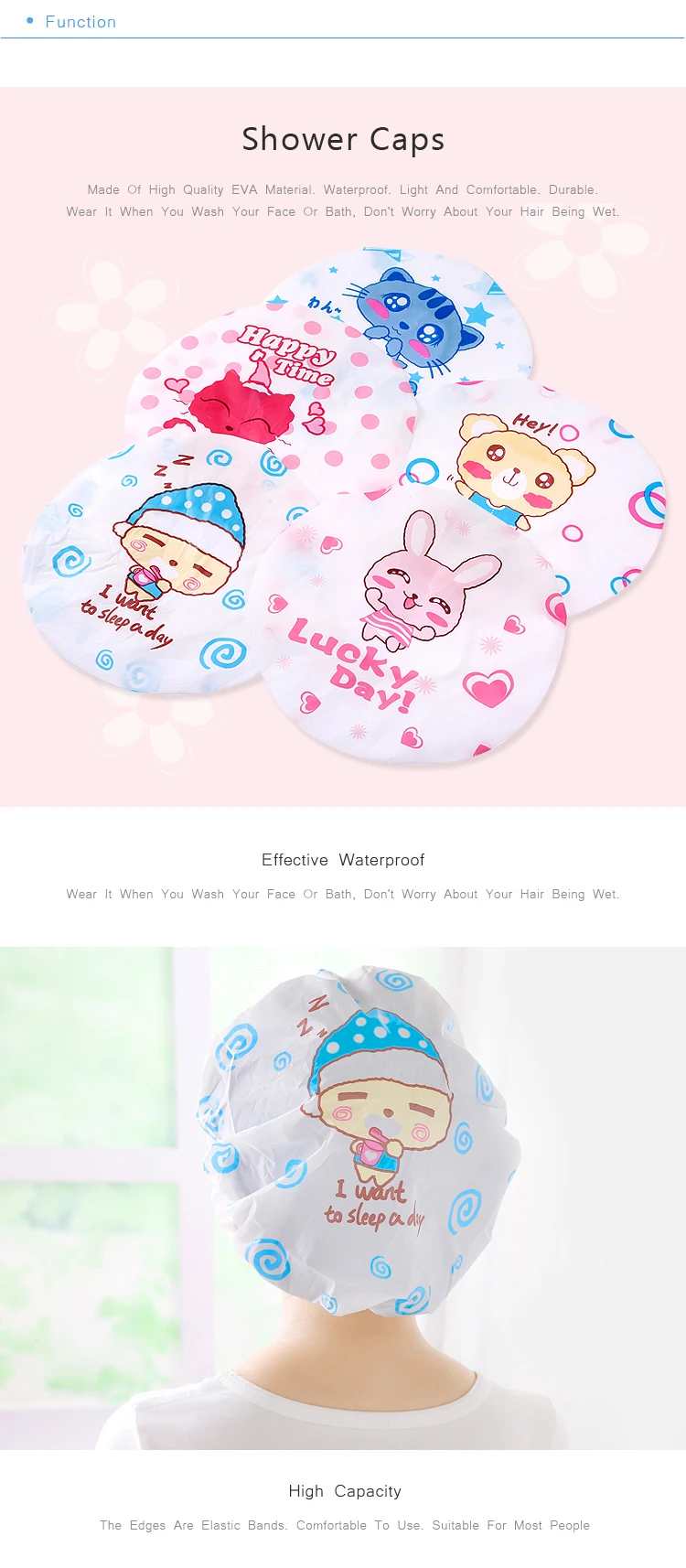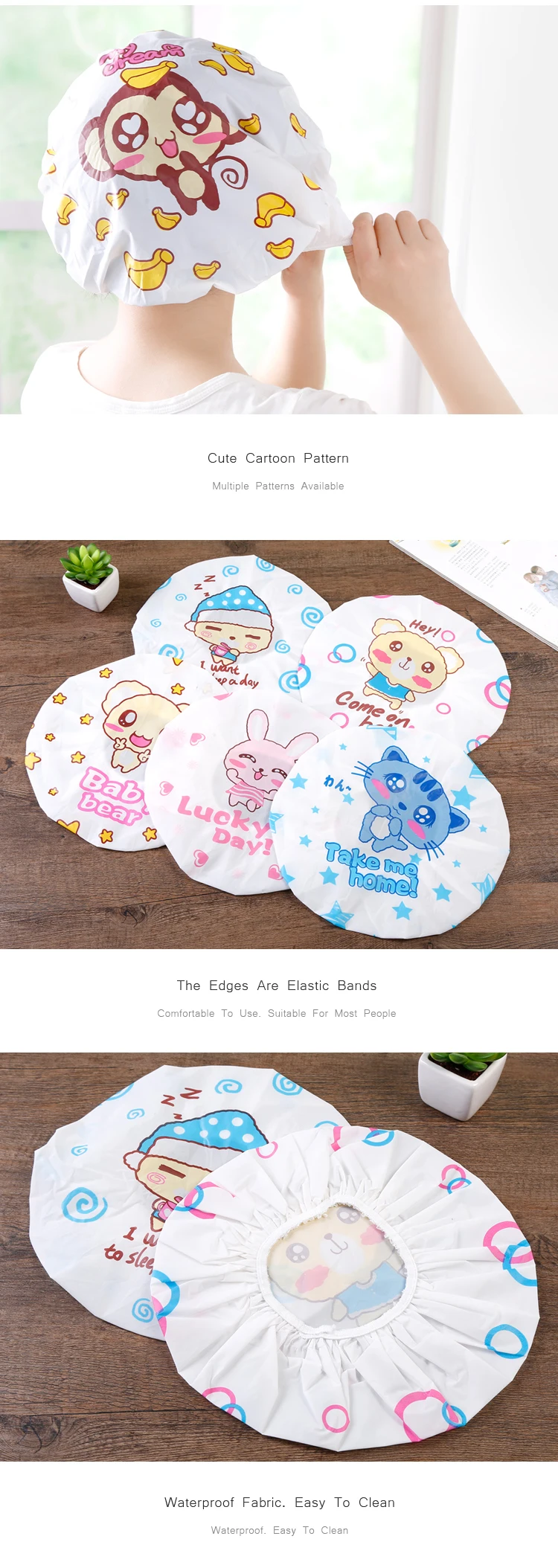 Характеристики: милая мультяшная водонепроницаемая шапочка для душа, эластичная лента по краям, Бытовые аксессуары для ванной комнаты, женская шапочка для душа с защитой от волос, удобная и практичная.