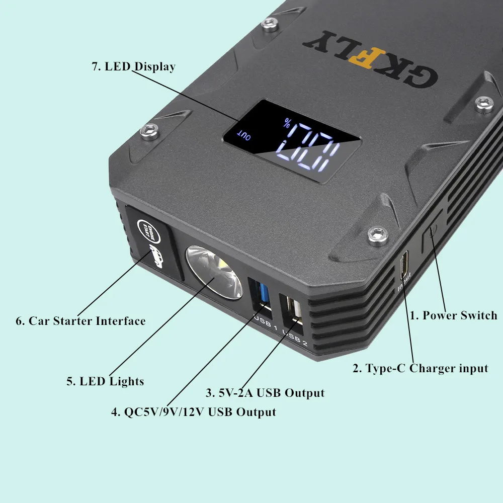 1. Выключатель питания2. Вход зарядного устройства Type-C3. Выход USB 5 В/2 А4. QC5V/9V/12V USB выход5 светодиодный светодиодные лампы6. Интерфейс стартера автомобиля7. Светодиодный дисплей