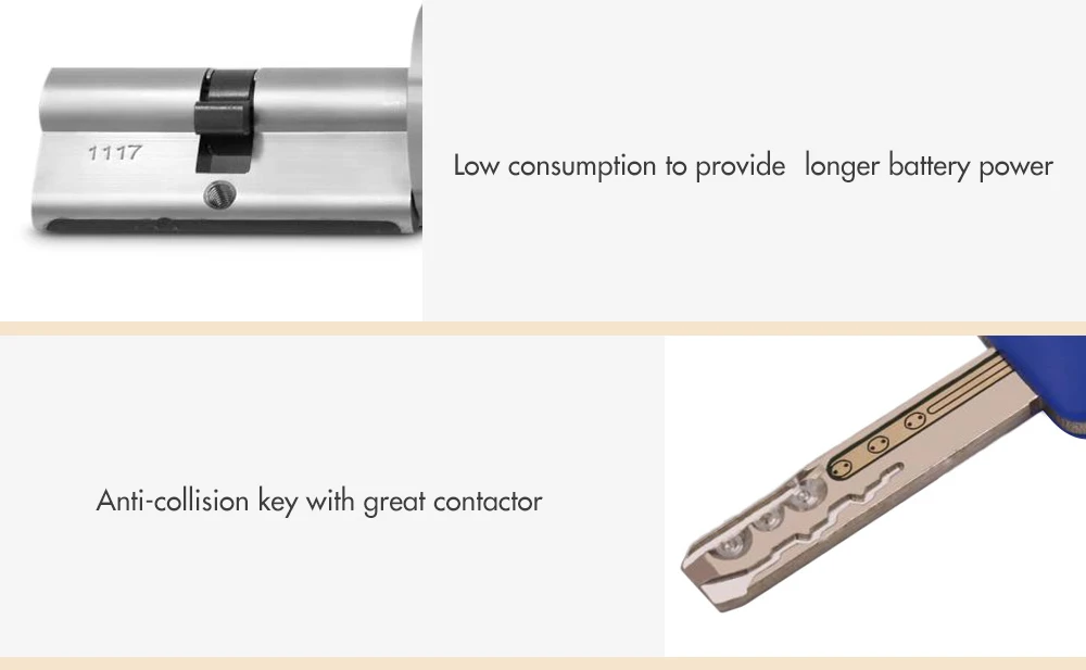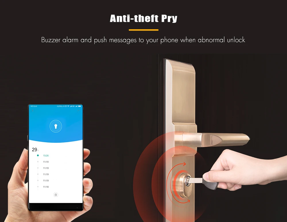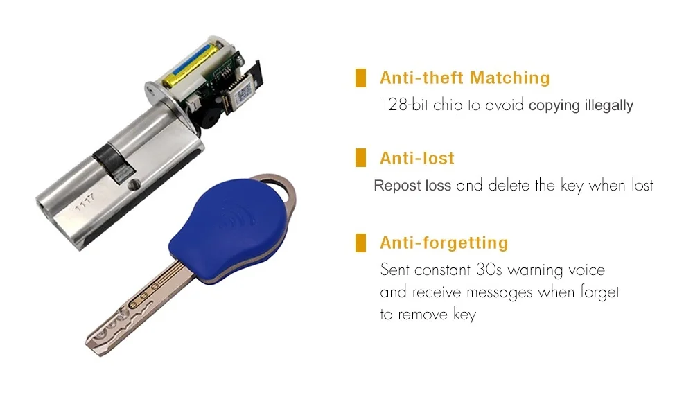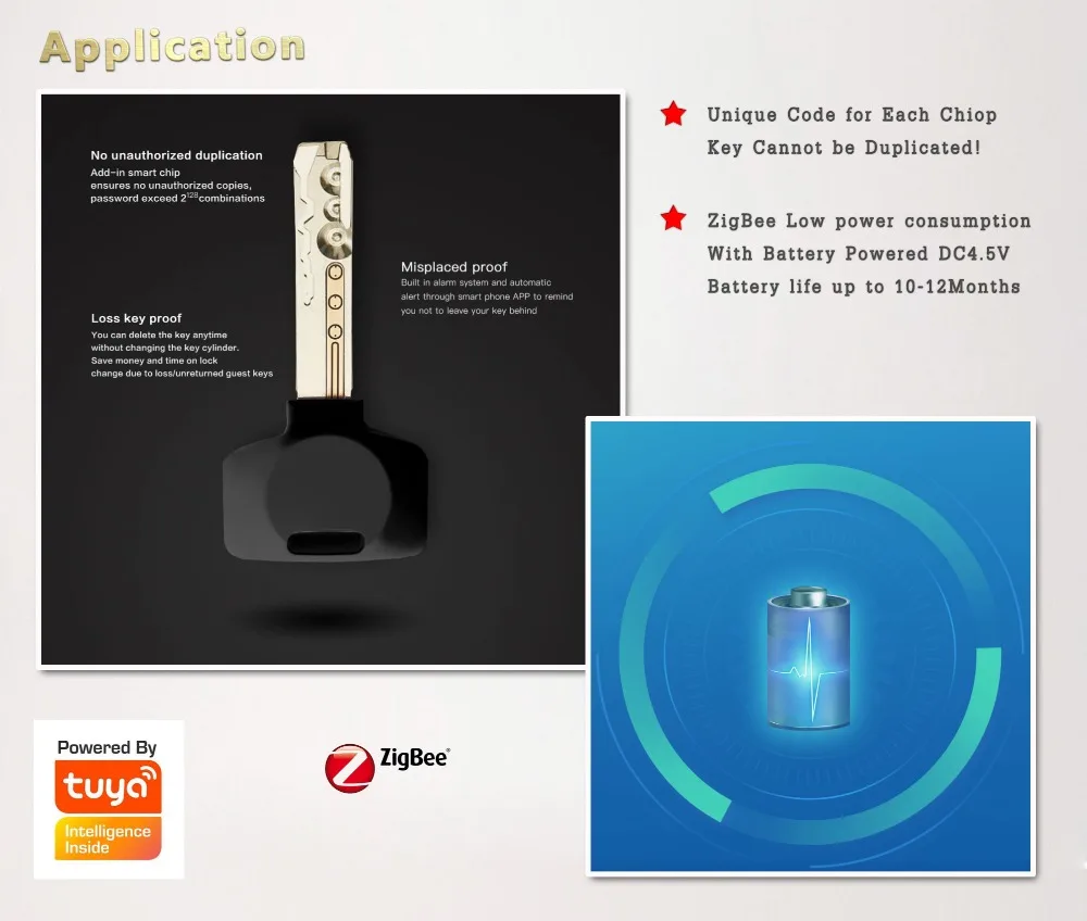 Если замок обнаружит попытку взлома, механизм блокируется, срабатывает Встроенный сигнал тревоги, и на смартфон пользователя будет отправлено push-сообщение с уведомлением. Встроенный чип использует 100-битное шифрование для защиты от перехвата данных. Вы можете заблокировать Потерянный ключ в настройках. Поддержка протокола Zigbee позволяет вам интегрировать этот цилиндр умного замка в систему умного дома.