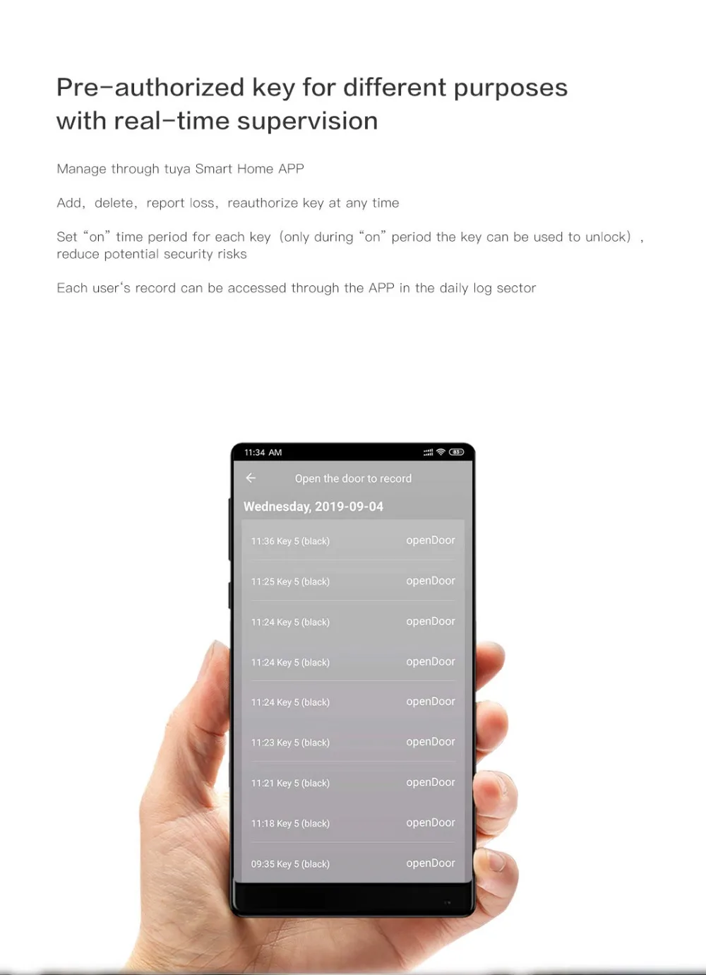 Этот цилиндр дверного замка включает в себя только сердечник замка, который устанавливается вместо обычного цилиндра. Партнер TUYA выпустил только четыре версии новинки для двери разной толщины. В комплекте есть Пять клавиш разных цветов, вы можете настроить время доступа для каждого ключа с помощью мобильного приложения. Смартфон также покажет, кто и когда открыл/закрыл дверь. Чтобы войти в дом, нужно повернуть ключ в замке.
