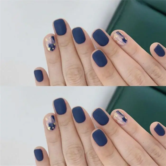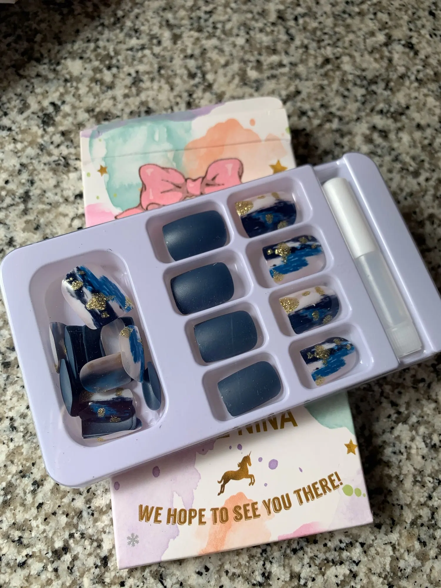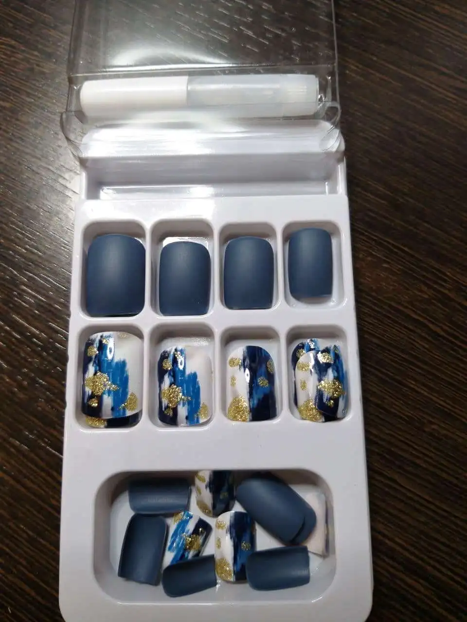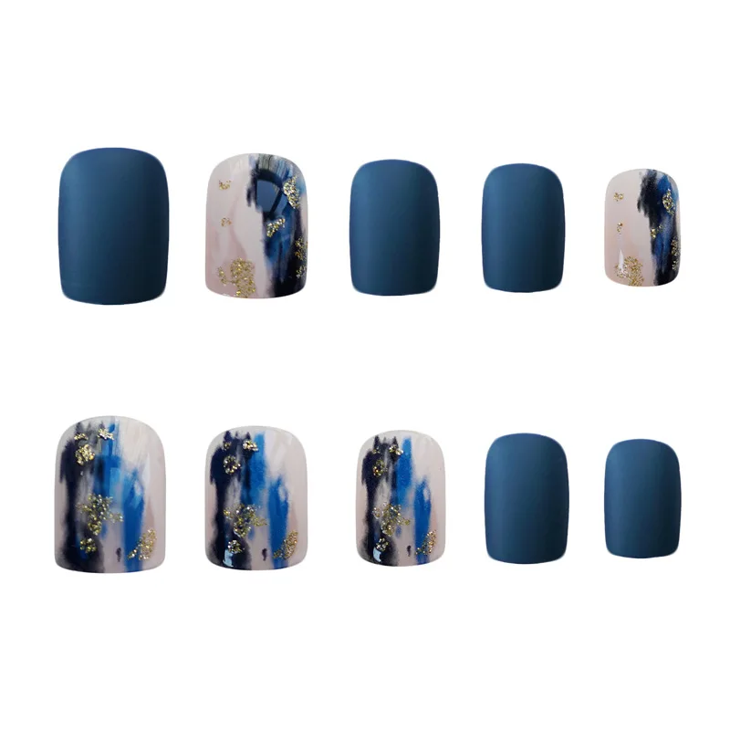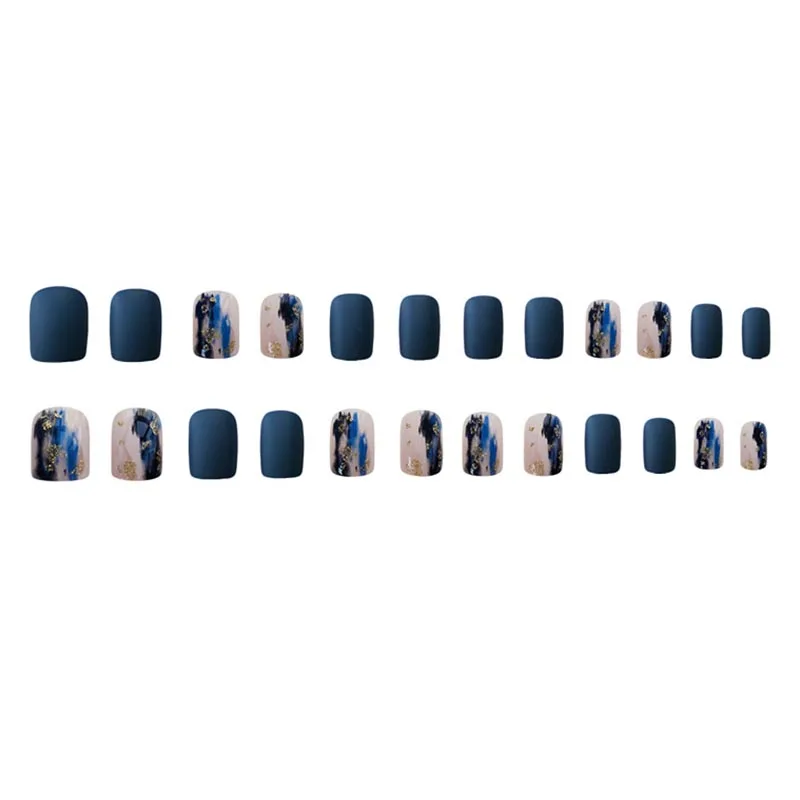 24 шт.коркор. синий краситель с блестками, декоративные накладные ногти, матовая квадратная голова, короткое носимое полное покрытие, искусственные ногти с клеем