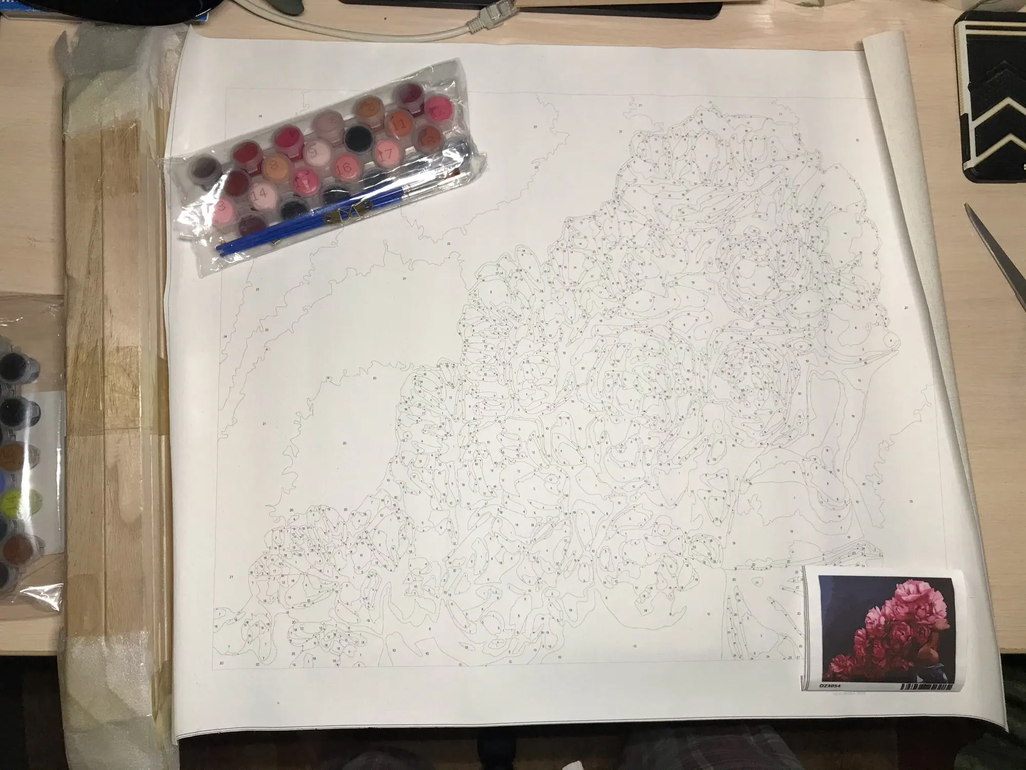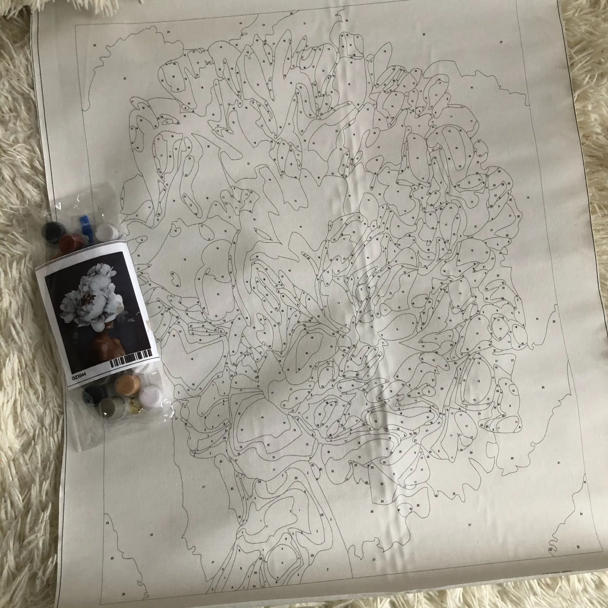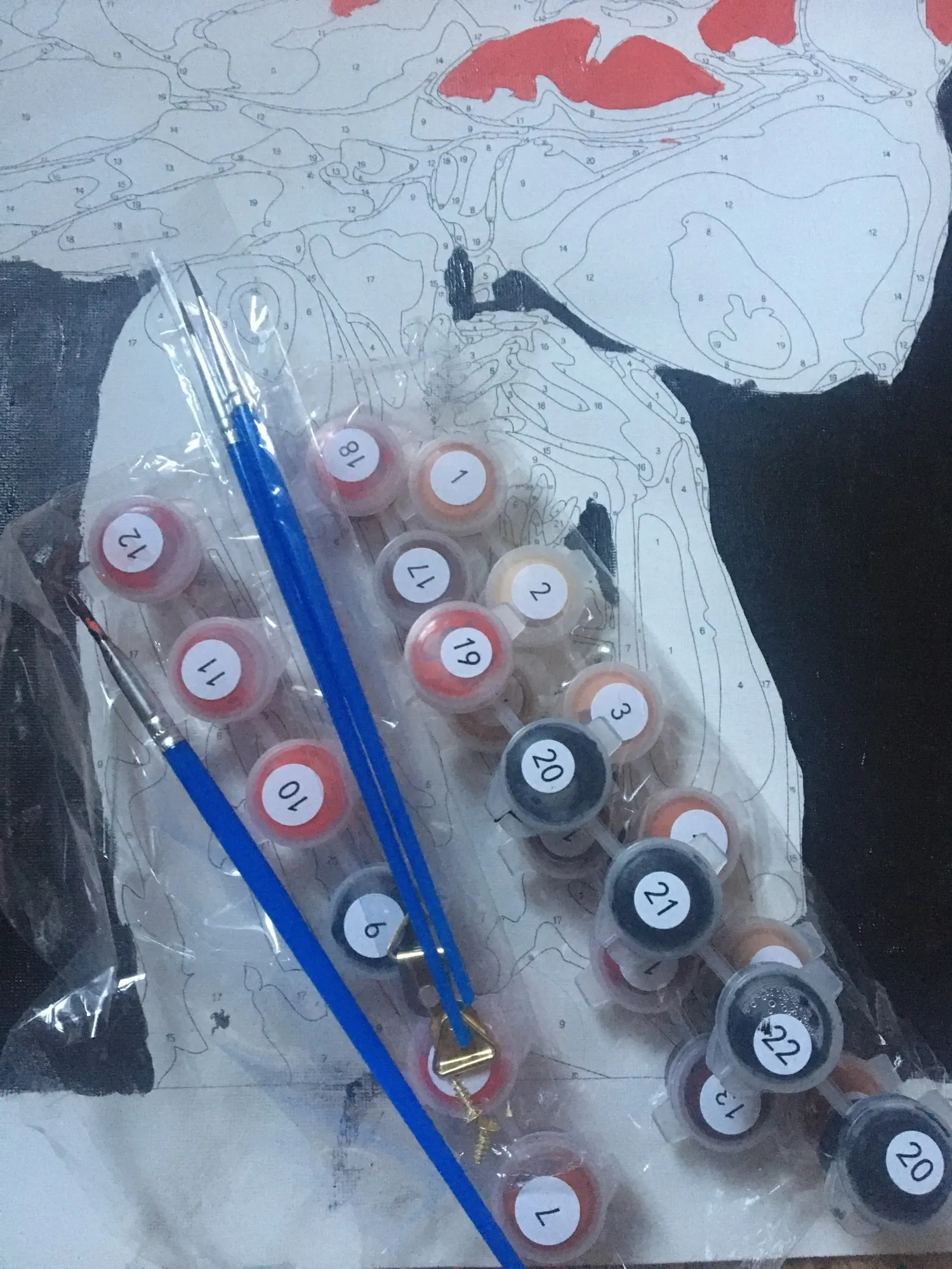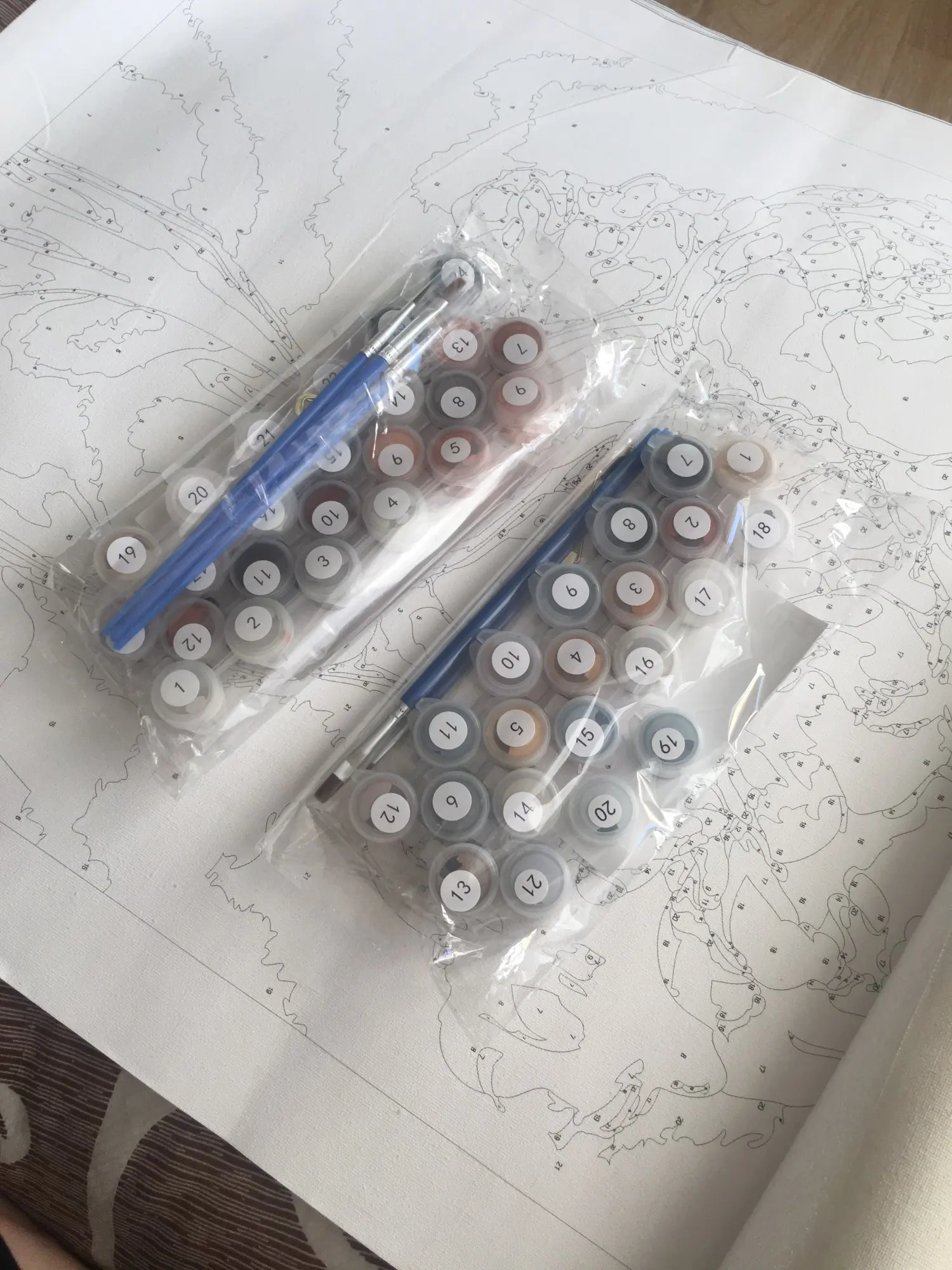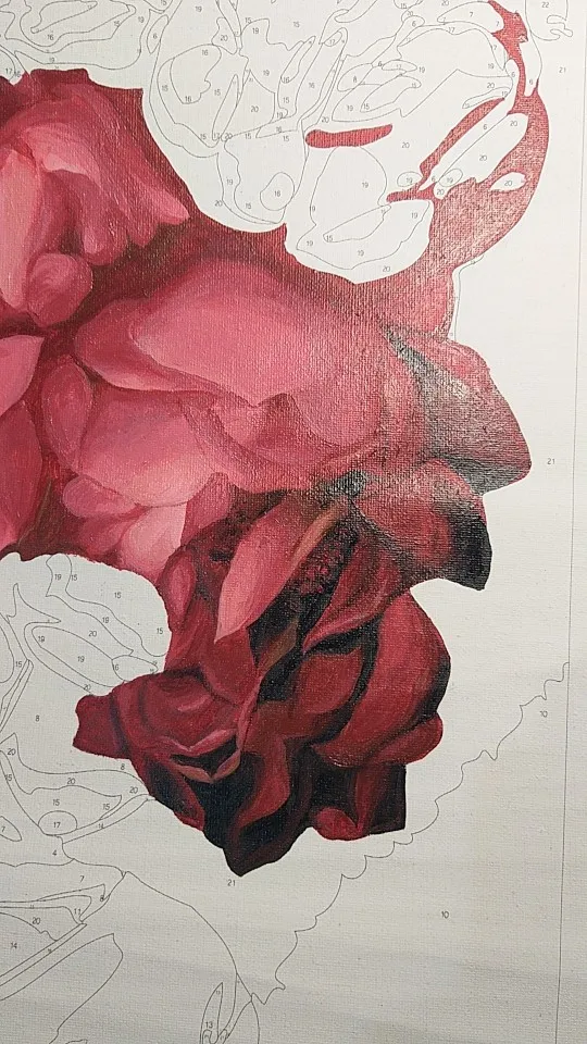 все круто на первый взгляд: холст нормальный, краски и кисти есть. но если присмотреться, то мелкие цифры почти не видно и не ясно какой цвета там нужен. сфоткала под макро, чтобы было понятнее.