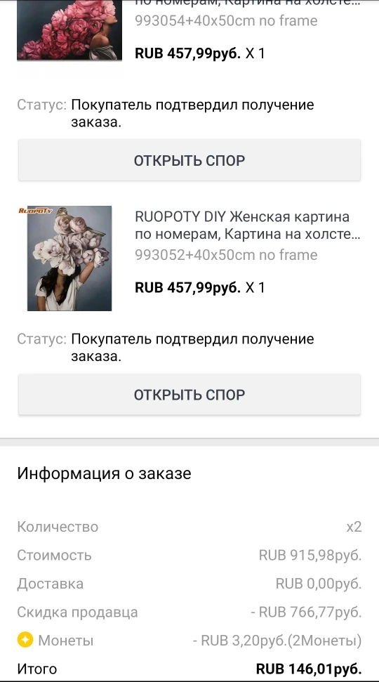 Получила картины после того как открыла спор, таможня завернула посылку. В последний момент продавец дал новый трек, оказалось что посылка уже прибыла в мое отделение почты. Вот что ему мешало за 3 месяца дать этот номер. Отменила спор и ставлю 5* за честность. Спасибо