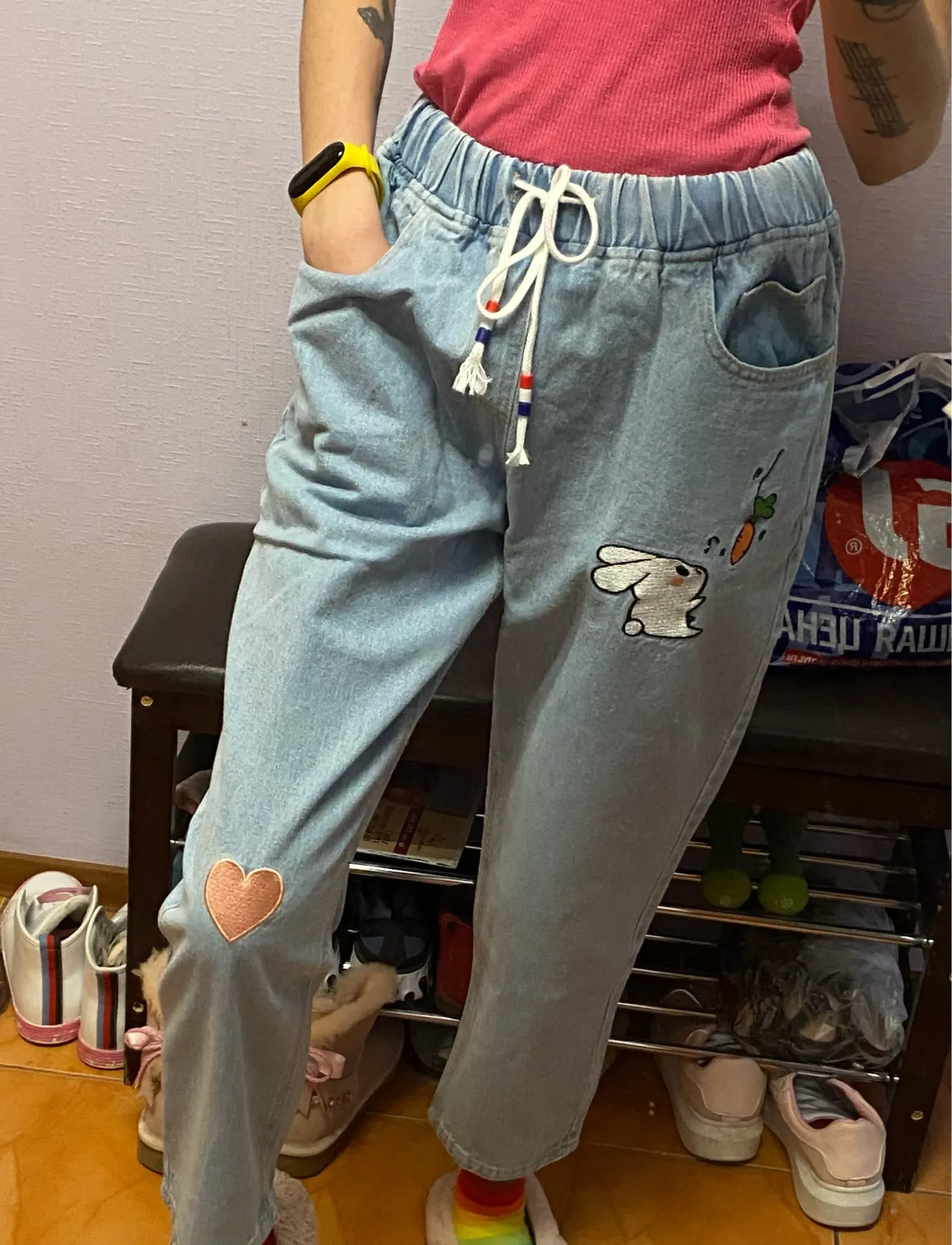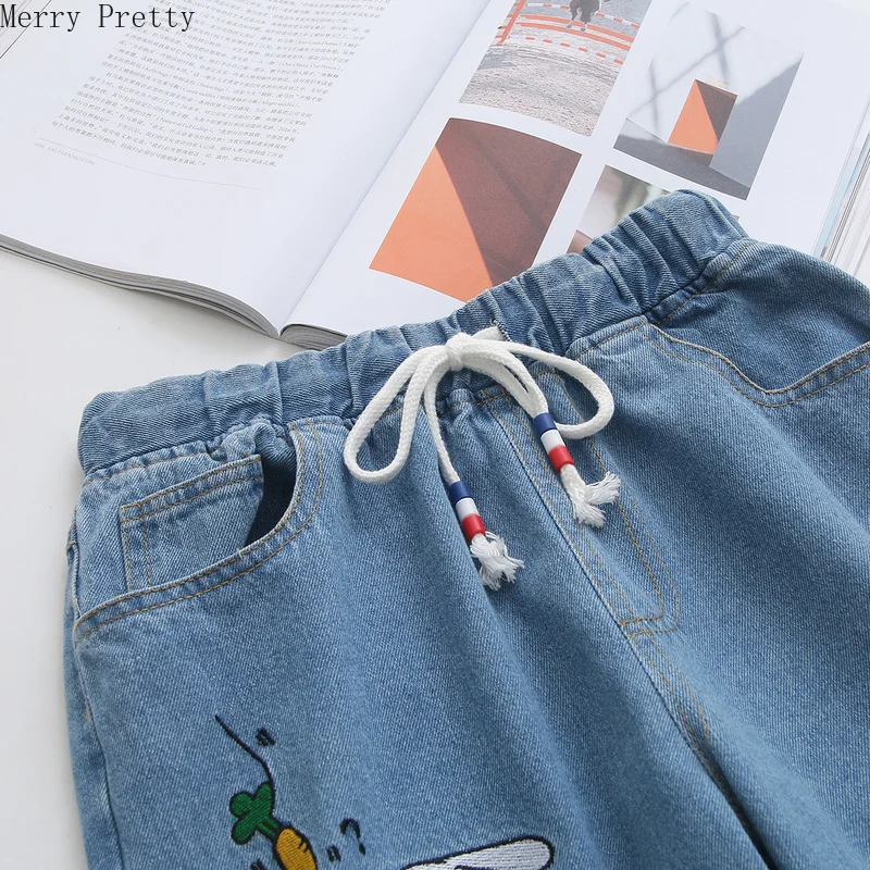 Джинсы женские прямые с мультяшной вышивкой, свободные стильные брюки из хлопка со средней талией, джинсовые брюки-бойфренды