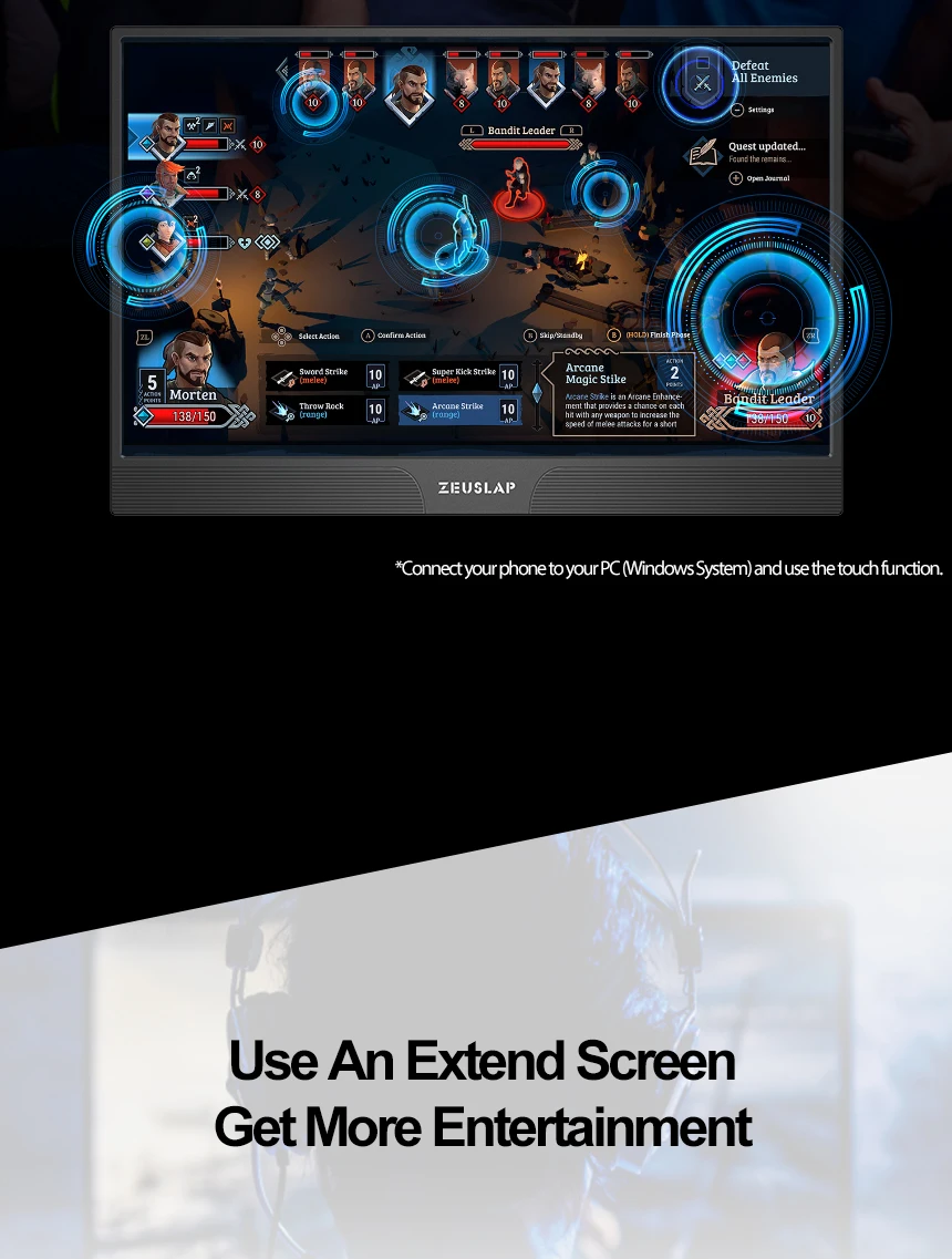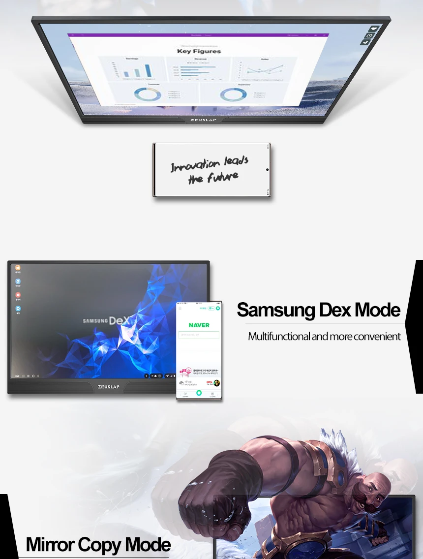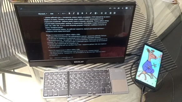 Монитор Zeuslap 15.6 тачскрин 1920х1080 . Huawei Mate 20X. Подключение к одим кабелем Type-C (Thunderbolt) Вторым кабелем можно питать от ЗУ, без питания выжирает 5000-й аккум телефона за 2-3 часа. . -- режим "рабочий стол", с тачскрином, можно лежать на диване с 15.6 планшетом на пузе и серфить по инету. Телефон на проводе лежит рядом и может использоваться как отдельное устройство - ребенок может играть в игрушки, например. Только кабель между устройствами ограничивает свободу. И ограничение: поле ввода и клава используются либо там, либо там. То есть один например документ печатает, а второй стилусом по экрану рисует. . -- режим "повторение экрана", тач работает корректно, хорошо для показа картинок с телефона толпе перед монитором.