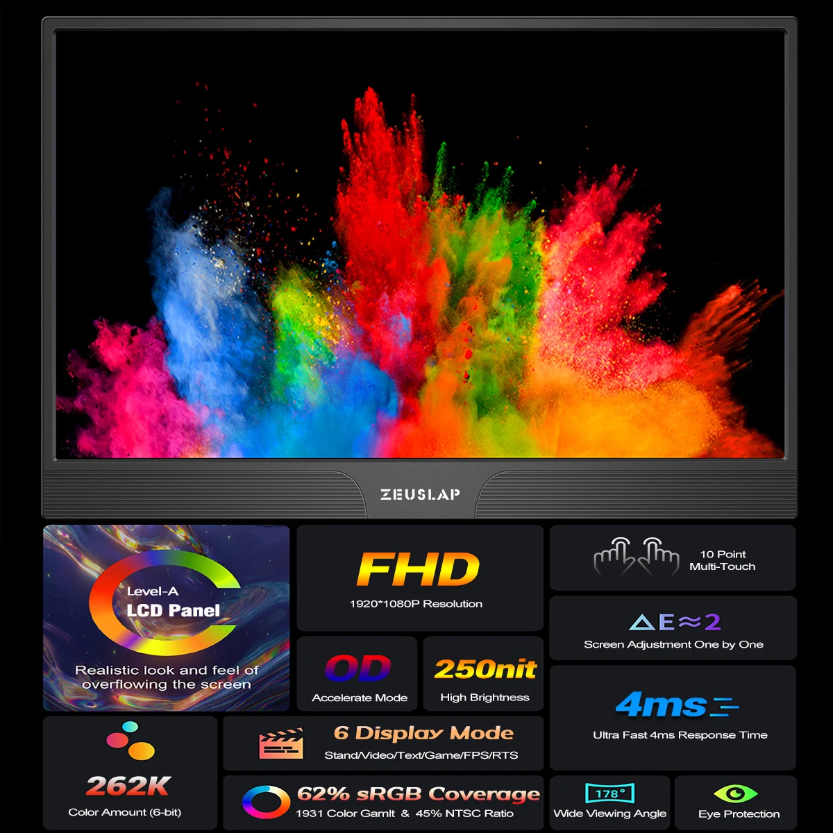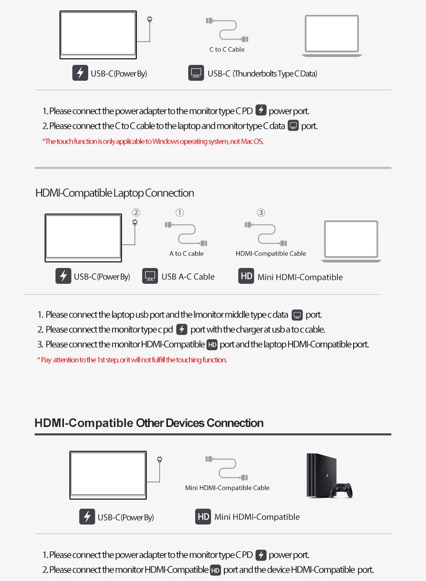 Il monitor è di buona qualità, colori abbastanza fedeli, buona struttura . Pregio è, oltre alle funzioni touch con Windows, la connettività con i cellulari dotati di usb-c, si può anche giocare con lo schermo touch. Con i dispositivi Apple funziona solo il mirroring, gran peccato. La spedizione è durata più di due mesi. Imballaggio ok e accessori in dotazione utili e di buona qualità.