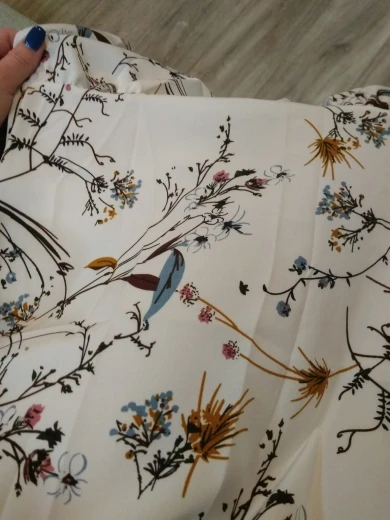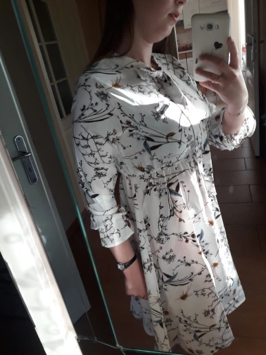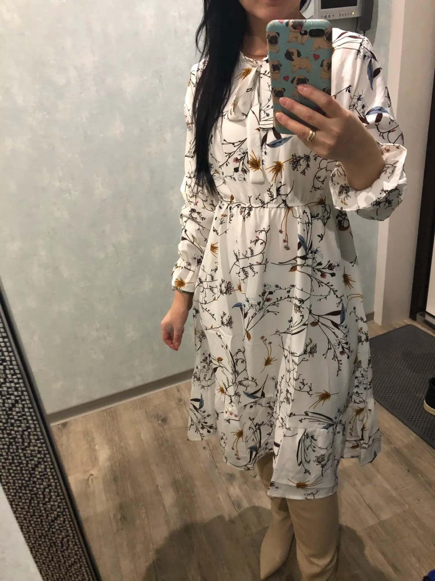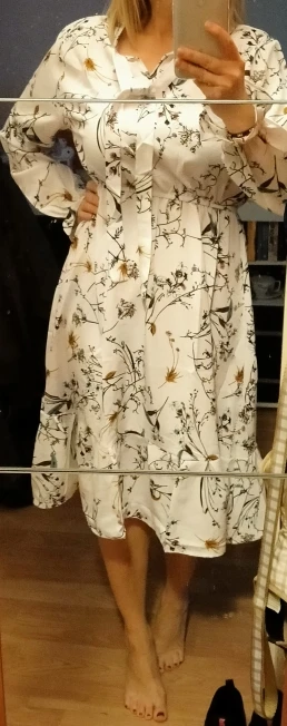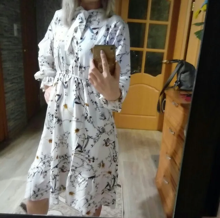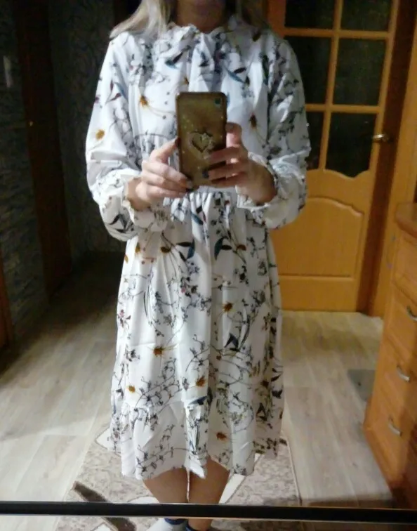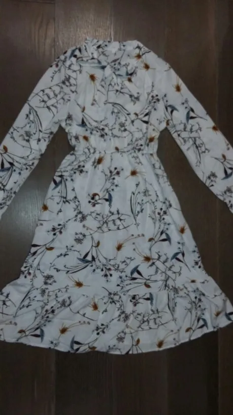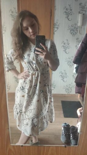 Ткань приятная;просвечивает белое платье; пришло быстро. Я миниатюрная 155см - на мне длина ниже колена, линия плеч не на месте и рукава длинные . Думала что узор на платье желтого цвета, а он оказался горчичного цвета. Платье немного переделаю - сделаю воротник на кнопку и рукава укорочу.