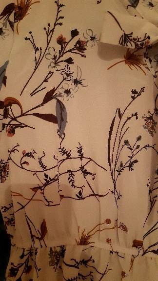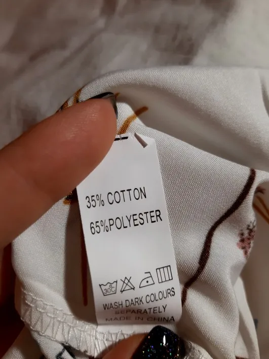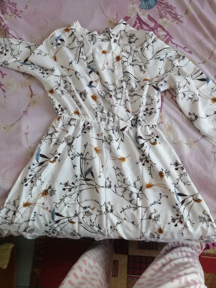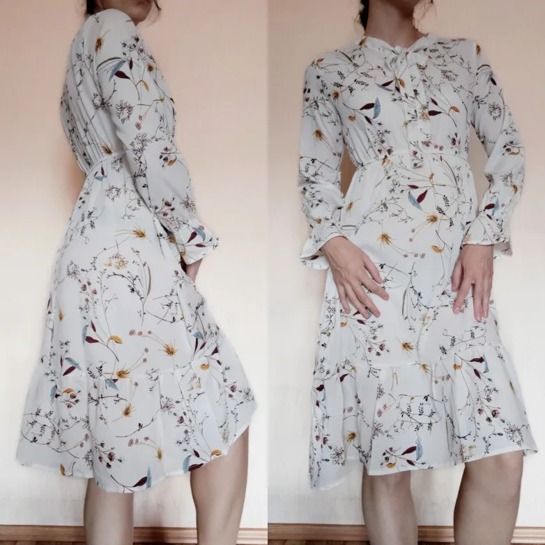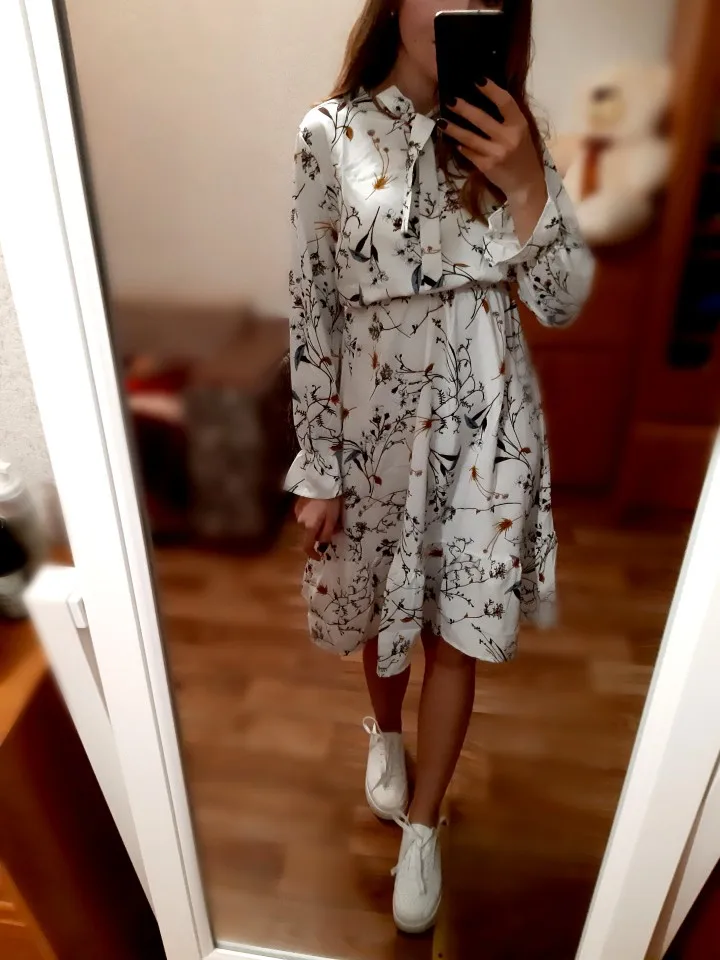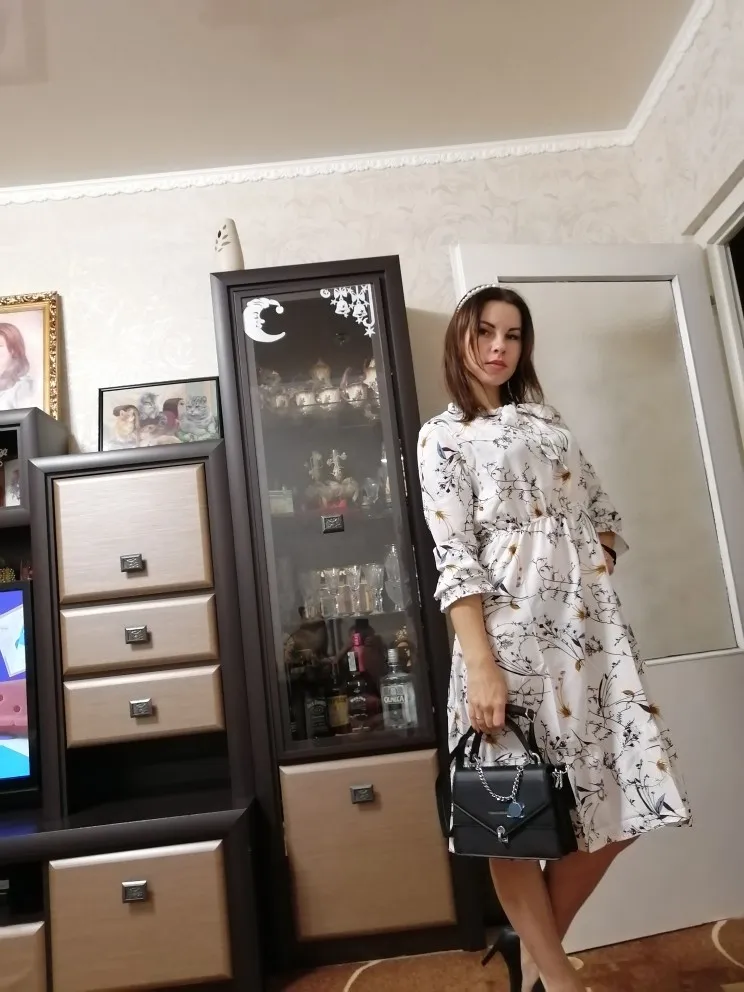 Ткань приятная;просвечивает белое платье; пришло быстро. Я миниатюрная 155см - на мне длина ниже колена, линия плеч не на месте и рукава длинные . Думала что узор на платье желтого цвета, а он оказался горчичного цвета. Платье немного переделаю - сделаю воротник на кнопку и рукава укорочу.