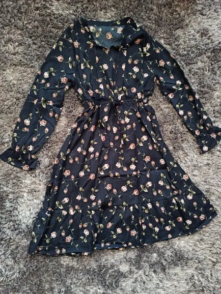 Очень красивое платье. На российский 46 размер подошло отлично. Резинка под грудью на рост 158. Рукава полная длина. Доставка мес до МО. Со скидками вышло 614₽ по распродаже. Можно носить как зимой первым слоем под пиджак, так и летом в не жаркую погоду. Рекомендую. На невысоких девушек отлично.