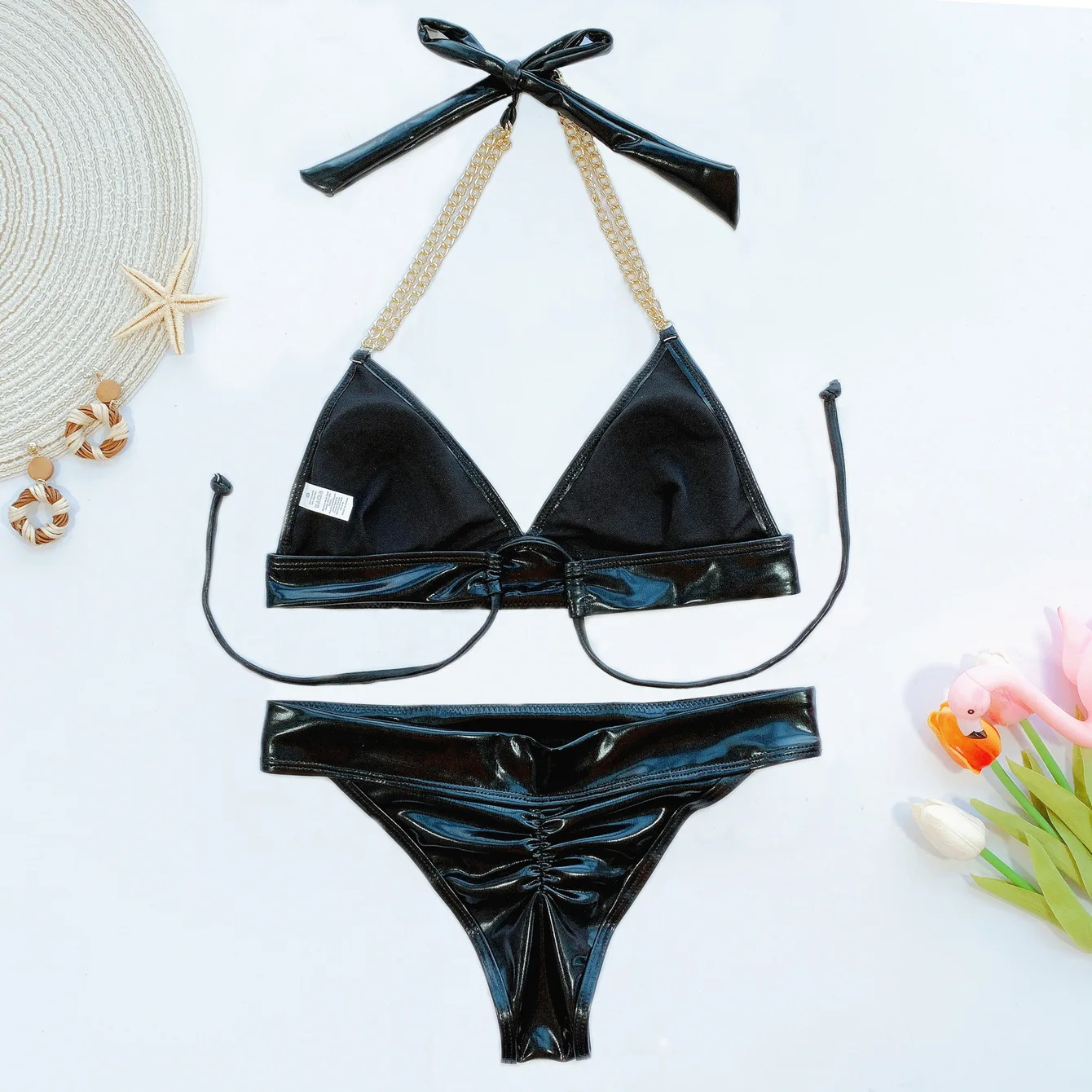 Женский сексуальный Экстремальный купальник из искусственной кожи, микро мини-стринги, бикини с металлической цепочкой, купальник на бретельках, пляжная одежда, купальный костюм