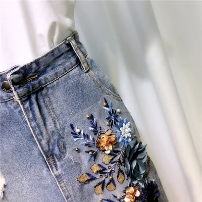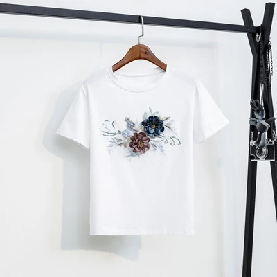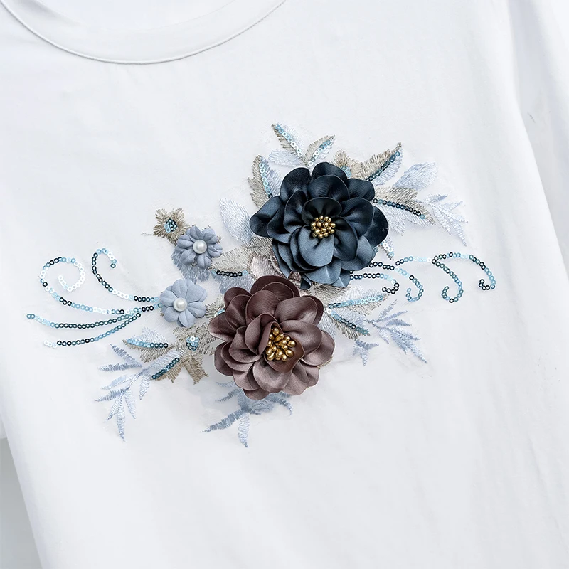 Женские летние костюмы из 2 предметов с 3D цветами, новая белая хлопковая футболка, топ и искусственная вышивка, набор с блестками