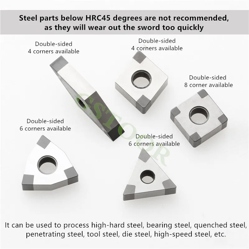 CBN: он обладает чрезвычайно стабильными химическими свойствами для черных металлов и используется для закаленной стали (45-65HRC), подшипниковой стали (60-62HRC), высокоскоростной стали (>62HRC), инструментальная сталь (57-60HRC), и охлажденный чугун, грубый поворот и точный поворот также подходят для высокотемпературных сплавов, материалов термического распыления, Твердые сплавы, содержащие более 10% Co и другие труднодоступные высокоскоростные режущие процессы, которые могут реализовывать токарные вместо шлифовки, что значительно повышает эффективность обработки