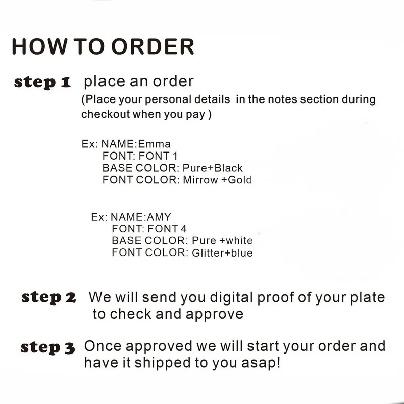 1: Оформляйте заказ2: укажите ваш пользовательский запрос в области комментариев заказа следующим образом:Название + шрифт # + цвет контура + цвет шрифта(Например: Amy + шрифт 1 + Блестящий розовый + золотой)Вы также можете оставить свой запрос в сообщении с помощью ID заказа.