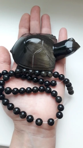 Бусы пришли через полтора месяцы. 8мм 48 штук на леске. Камень натуральный обсидиан. На фото вместе с черепашкой из этого же минерала, которая была привезена из Мексики, где имеются залежи этого обсидиана.