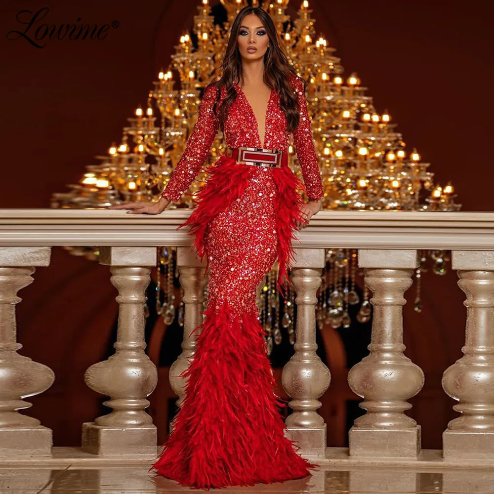 Вечернее платье-Русалка с глубоким V-образным вырезом и красными перьями, с блестками, 2020