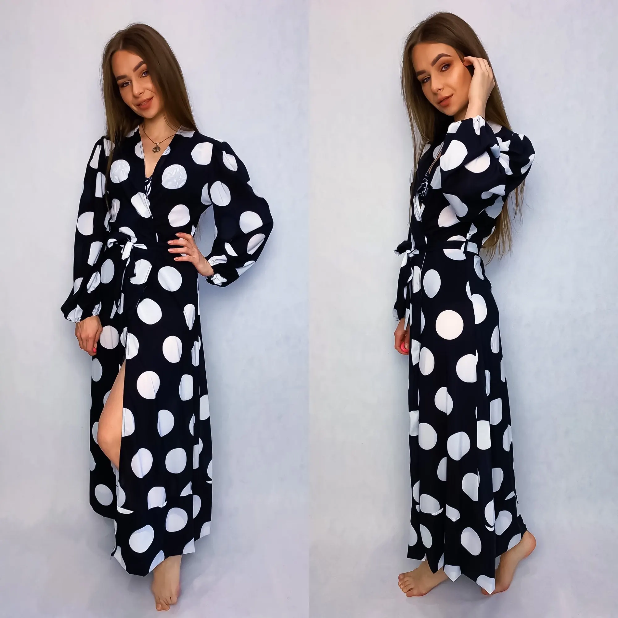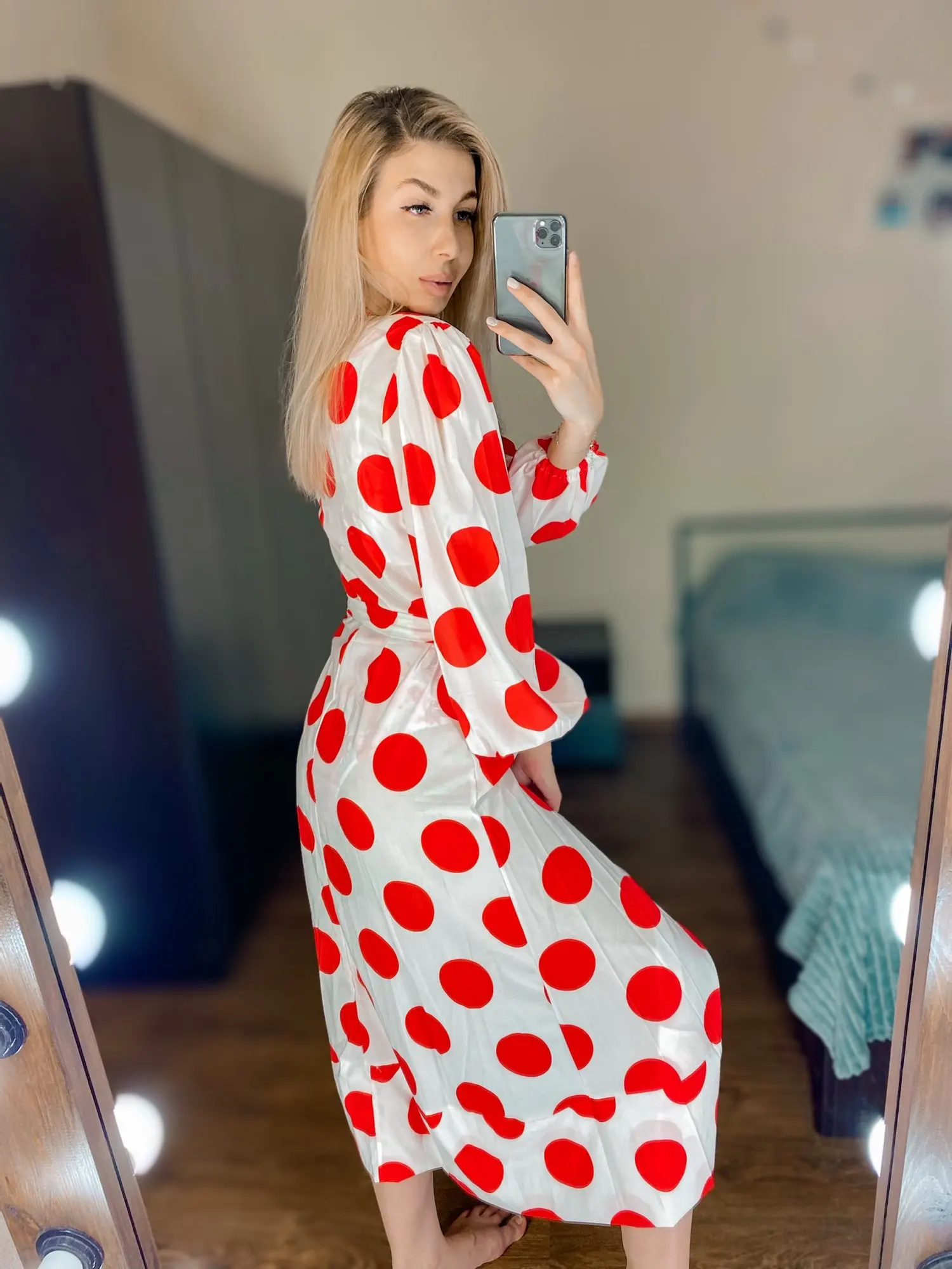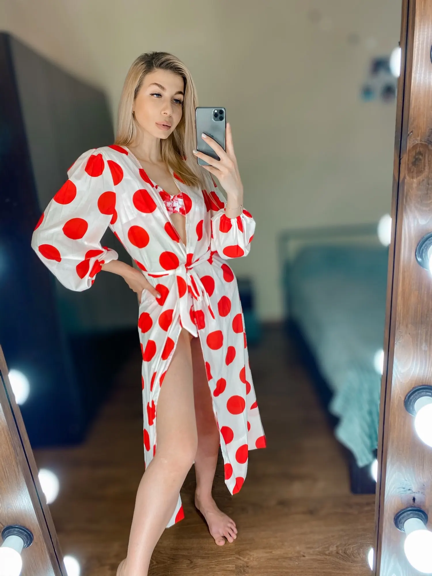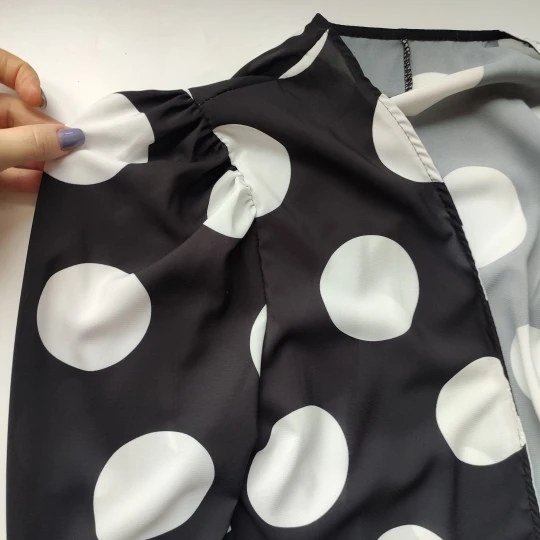 Мой Inst:Ksenia.d.beauty На свои параметры 87-69-92 и рост 164 см выбрала размер S, надо было брать размер M. Мне хотелось бы более свободную посадку. Получилось совсем впритык Модель накидки на запах. В комплекте идёт пояс из той же ткани. По составу 100% полиэстер, электризуется, антистатик с этим отлично справляется. Рисунок в крупный горох. Довольно обязывающий, под чёрный или белый купальник, чтобы не смотрелось аляписто ☝️ Качество пошива хорошее, есть немного торчащих ниток. Принт на спине не сходится.