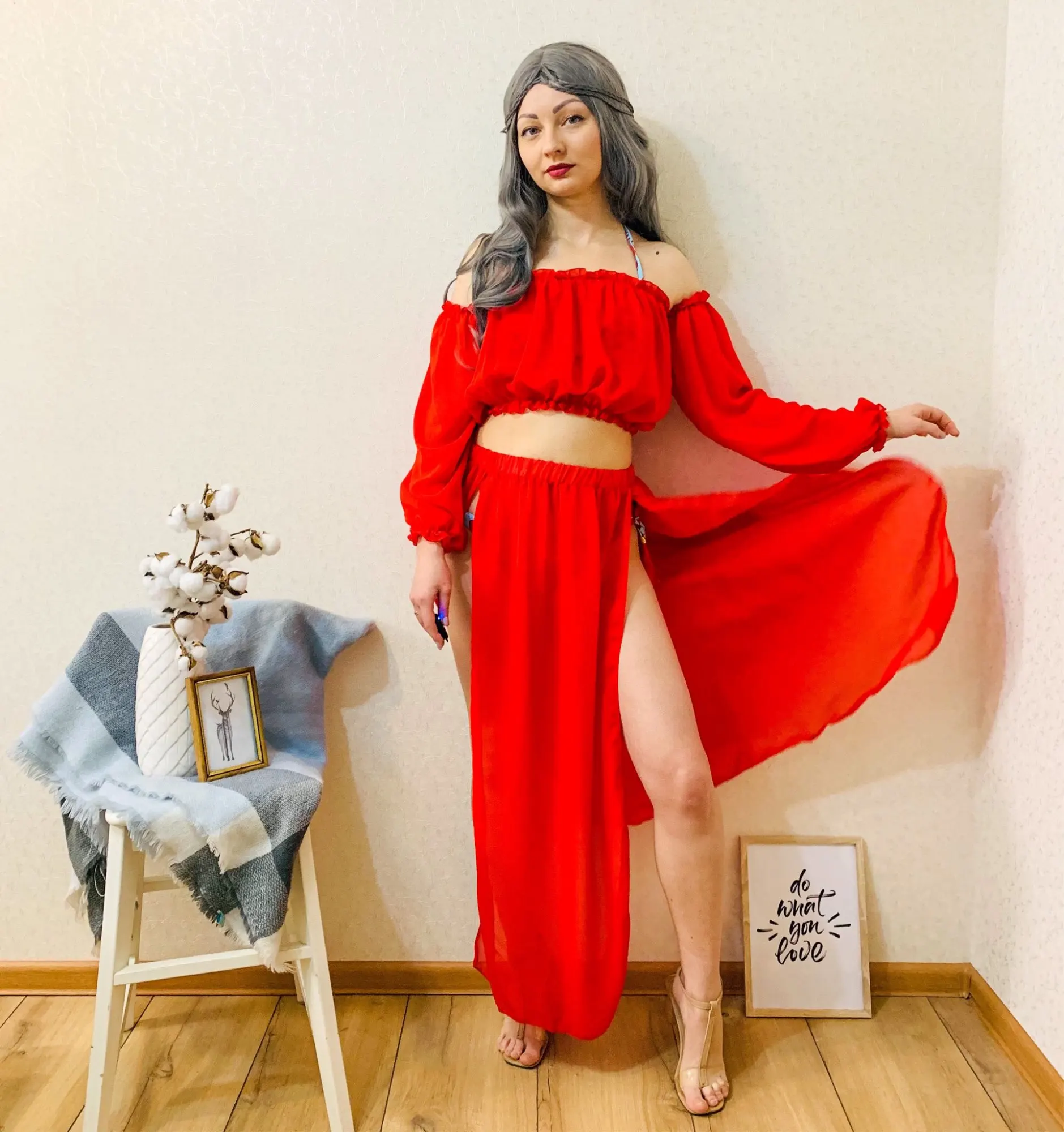 Мой Inst:Ksenia.d.beauty Простейший по пошиву костюм, но смотрится весьма эффектно Ткань струящийся, лёгкий, полупрозрачный полиэстер. Немного электризовался после глажки, но антистатик не понадобился. Единый размер подошел на мои параметры 87-69-92 и рост 164 см. Топ на резинке сверху и снизу, рукава пришиты отдельно, так же на резинке. Верхняя резинка на рукавах мне немного давит. Юбка с двумя глубокими разрезами. Пояс на плоской резинке, она не вшита, периодически приходится поправлять, чтобы не переворачивалась. Качество пошива отличное. Никаких торчащих ниток.