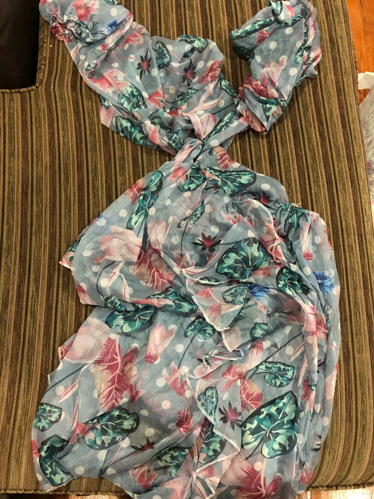 Доставка была не длительной, упаковка стандартной. Платье приехало без негативных нюансов. Расцветка в моём случае просто волшебная - сочетание цветов мне очень понравилось. Материал достаточно плотный и синтетический, но в принципе для выхода к морю в вечернее время платье вполне подходит. Что отмечу - материал склонен к электризации, потому либо антистатик, либо не забываем наносить крем для загара - он тоже снимает статику )) На свои объёмы 86-67-94 при росте в 162 см я выбрала S. Размер подошёл. Это накидка, которая выполнена в виде платья, но без застежек. Платье фиксируется на талии внахлёст с помощью пояска . Накидка сама по себе не слишком пышная, потому оборка, пришитая по низу, смотрится здесь Рукава по свободному краю собраны на резинку. Качество пошива в порядке. Накидка смотрится классно, хотя она не настолько лёгкая, к принято для пляжной одежды.