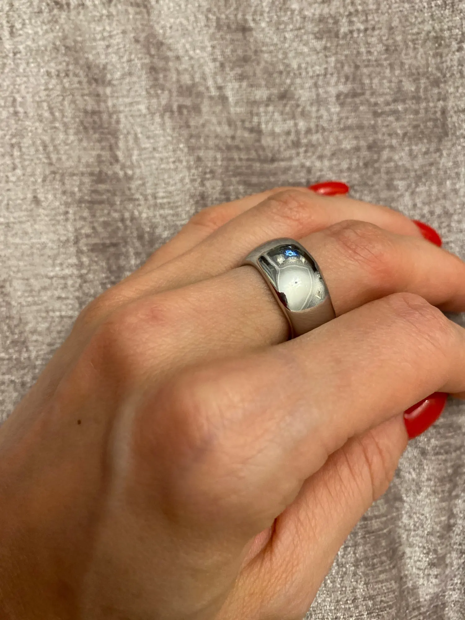 Кольцо смотрится хорошо. Но есть огрехи в покрытии в виде мелких вздутий, и на нем остаются следы от пальцев.