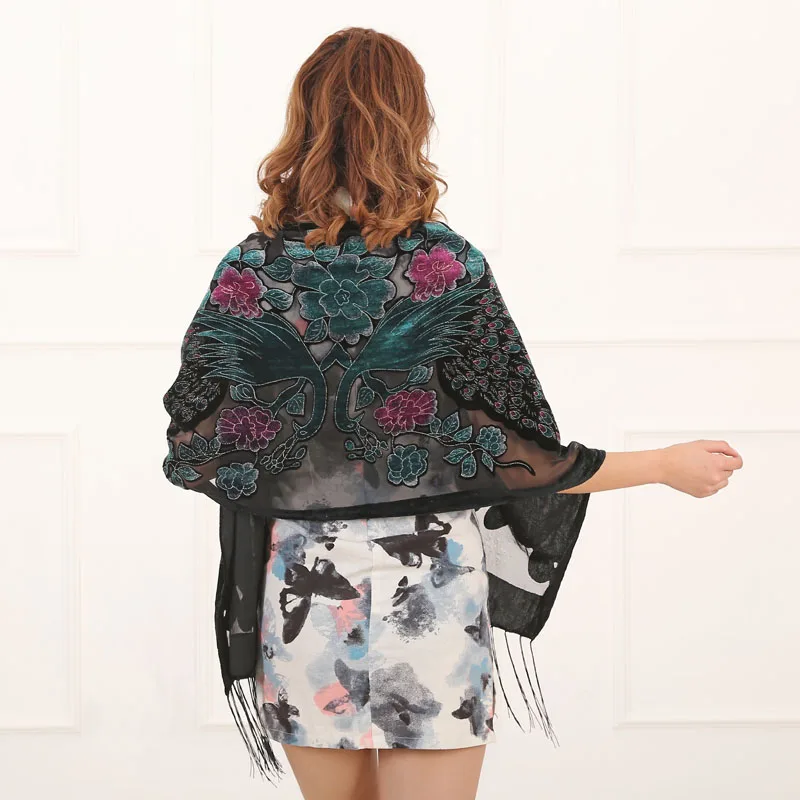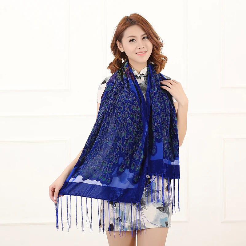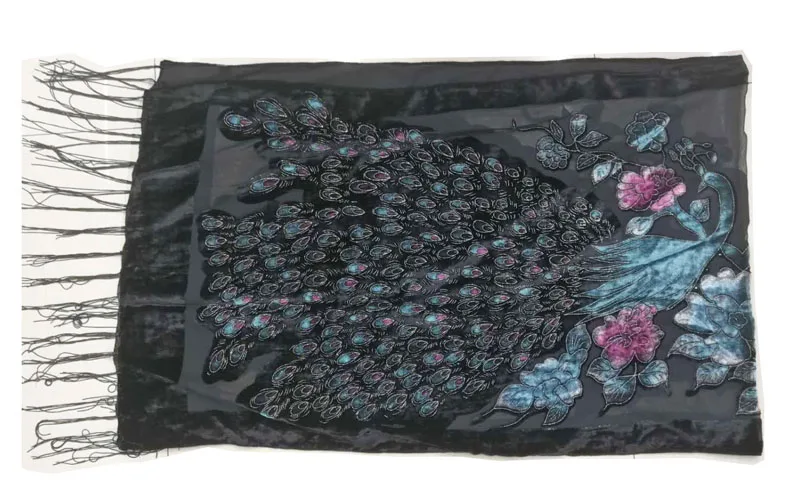 Роскошный шарф с принтом Павлин, зимний женский Шелковый бархатный шарф с принтом, шаль для свадьбы, США, популярные вечерние пончо