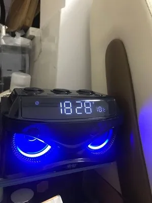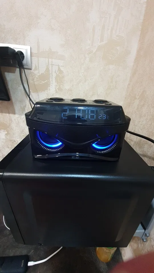 Качество звука очень хорошее, первый из тех же видов продукции! Чистый звук высоких и низких частот, звук трех динамиков, объемный стереозвук и тяжелый бас еще более шокирует! Внешний вид также является первоклассным, внешний вид классный и индивидуальный, с экраном, вы также можете проверить время и установить будильник. Превосходный опыт