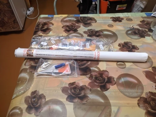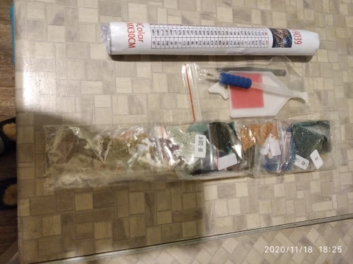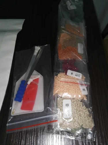 Очень классная картина, правда, это на первый взгляд. Только начала дочка выкладывать, когда будет полностью готова, сброшу фото. Спасибо за хороший комплект инструментов - удобная ручка, пинцет, насадка. Продавца рекомендую на все 100%!