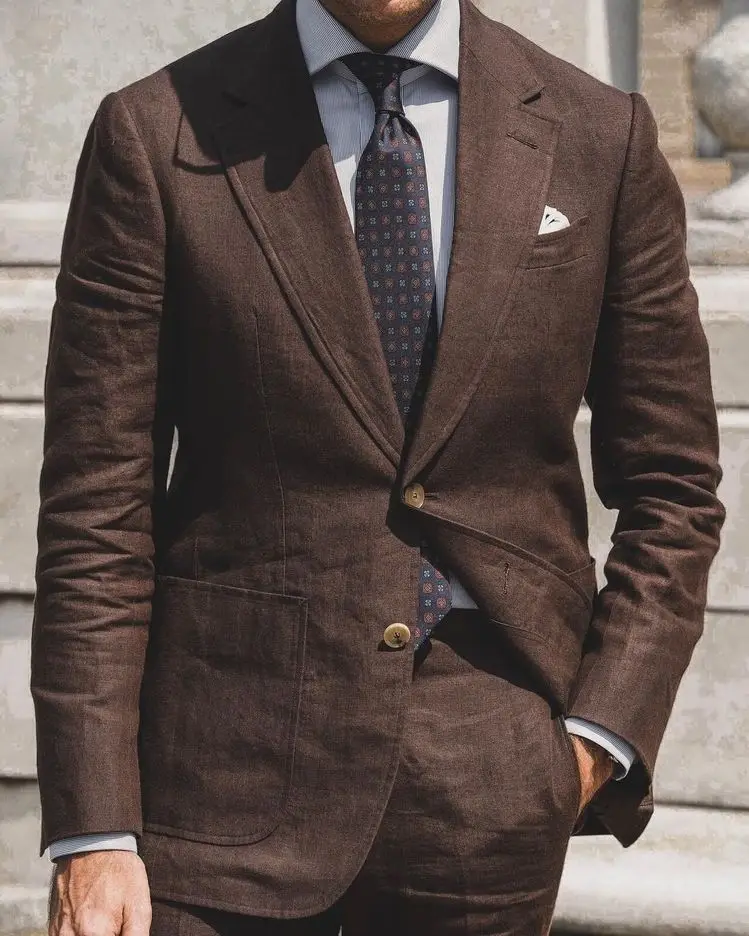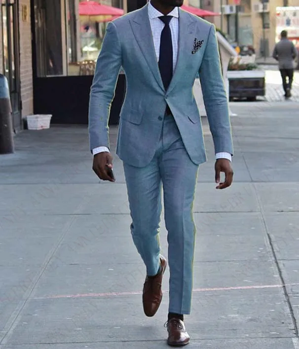 Мужской льняной костюм для жениха, костюм из 2 предметов, пиджак и брюки, Повседневный, модный, синего цвета