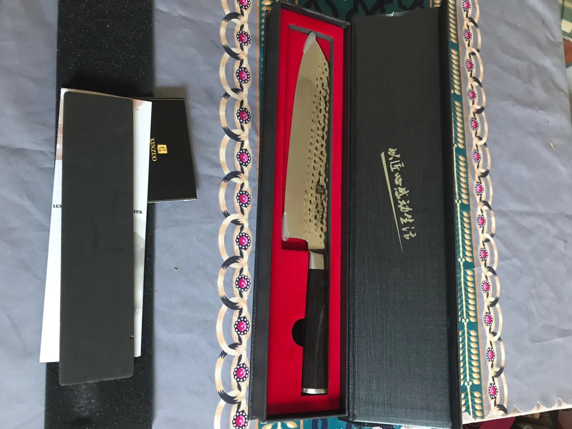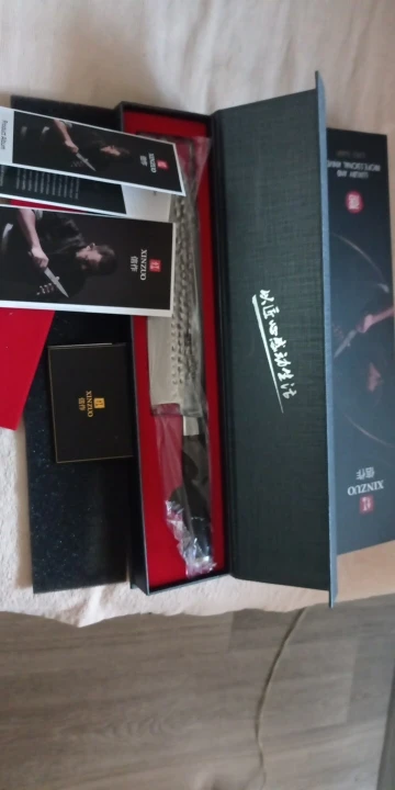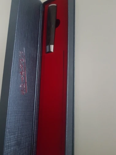 sehr scharf, das Damast muster ist aufgebracht, sieht aber gut aus, nicht so deutlich wie auf den Bilden Verpackung sehr gut, aber kein Schutz für die harte Schneide, kann nicht in die Schublade gelegt werden, wegen Verletzungsgefahr und Bruchgefahr der Schneide. Werde es in der Box aufbewahren.
