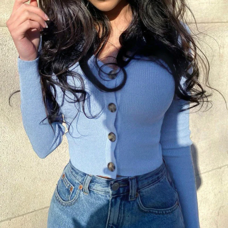 Женская трикотажная блузка с V-образным вырезом и длинным рукавом