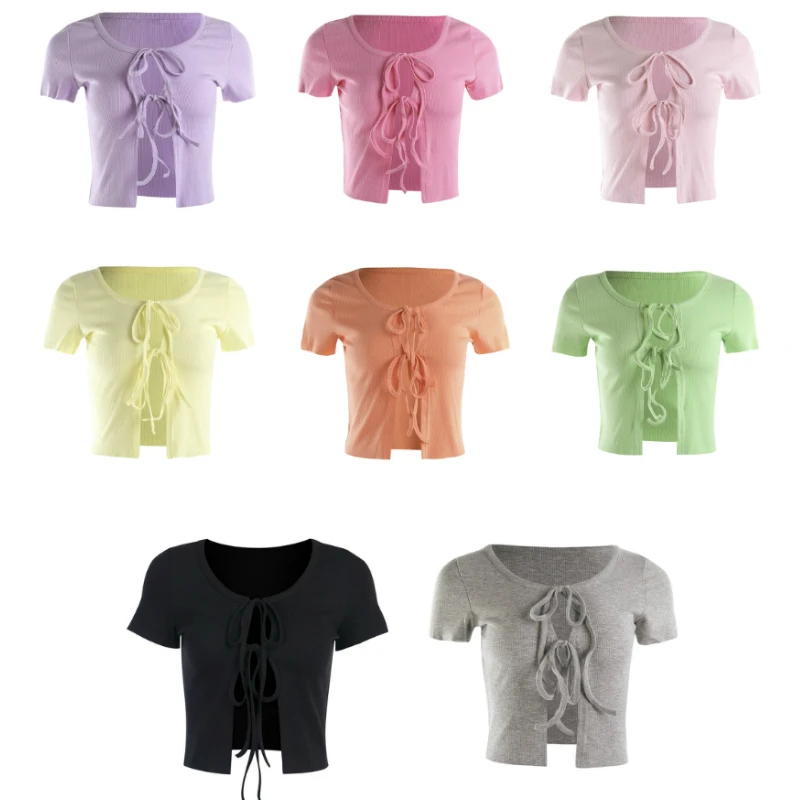 УКОРОЧЕННЫЙ ТОП Musuos, Женская Повседневная Сексуальная футболка с завязками, вязаный в рубчик, тонкий эластичный кардиган, футболки, летняя и осенняя одежда