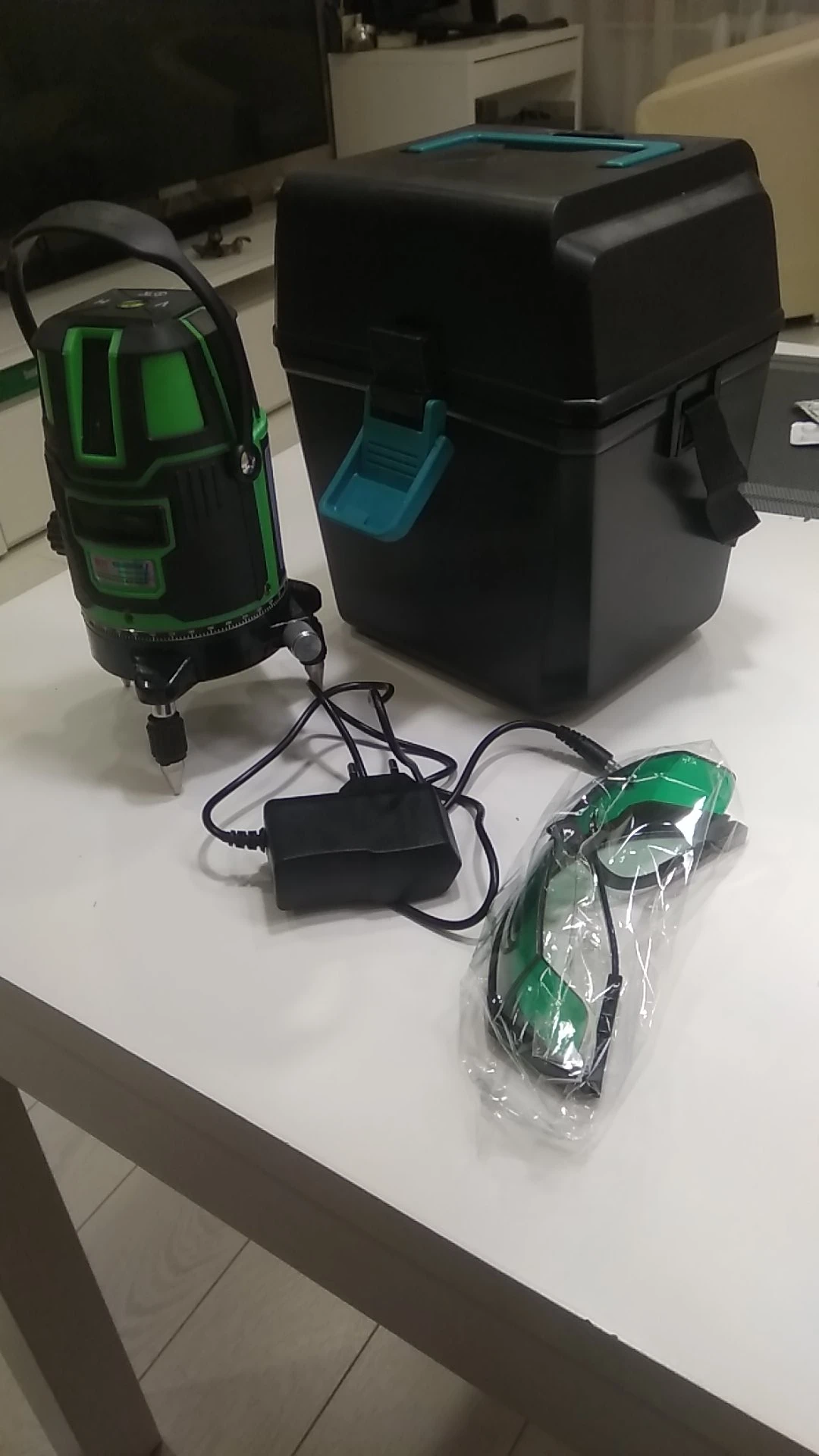 Каство превзошло мои ожидания .На вид большой. Пластиковый кейс не помят. Светит ярко устают глаза . Уже выронил по уровню шкаф.Не смог понять полностью выключить.Вертикаль и горизонталь отключил , но полностью не отключается нет кнопки.Вынимаю одну батарейку для безопасности от детей. Качество пластика на вид хорошее(прочное).