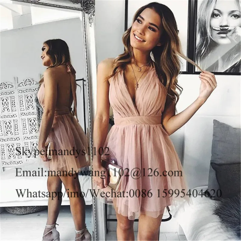 Мягкие фатиновые Короткие коктейльные платья 2020 элегантные вечерние платья с v-образным вырезом и открытой спиной для выпускного вечера для женщин Дешевые платья