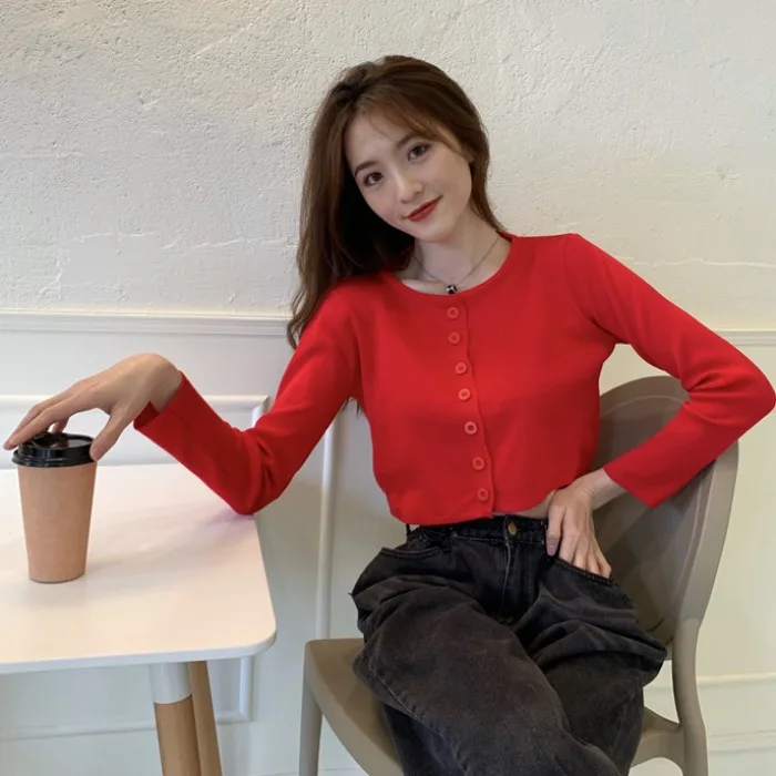 Женский вязаный кардиган на пуговицах, милый Укороченный кардиган в Корейском стиле, уличная одежда, осень 2019