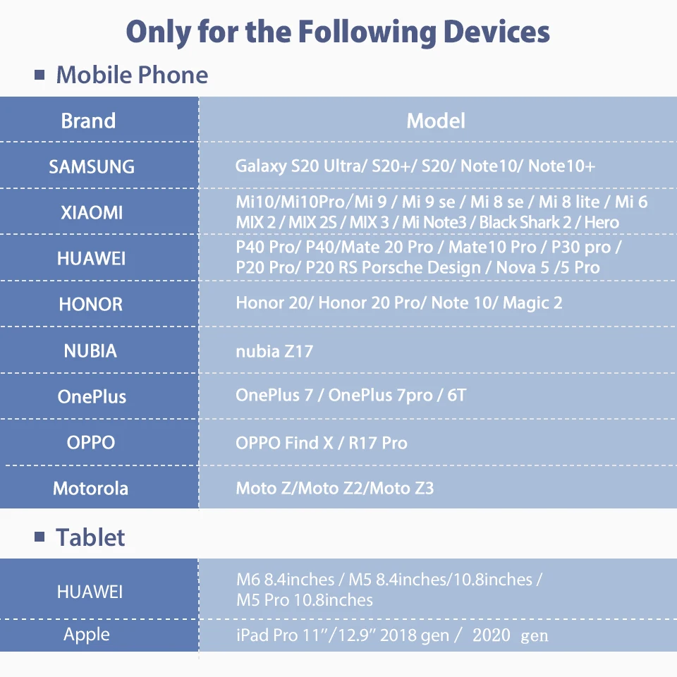 5. Широкая совместимость:Подходит для следующего устройства: ДляApple Ipad Pro11 ''/12,9'' 2018 / 2020 ДляСяомиMi 10/ Mi 10 Pro/Mi 9/Mi9 se/Mi 8/Mi8 se/Mi8 lite/Mi 6/Mi 6x/Mi 5x/Микс 3/микс 2/Макс 2/Mi 2S/Mi Note 3/Black Shark 2/Helo ДляХуавейP40/ P40 Pro/ P40 Pro Plus/P30/P30 Pro/P20/P20 Pro/Mate 20 Pro/Mate 10/Мате 10Pro/P20 RS Porsche дизайн; Nova 5/5 Pro; Хонор20/20 Pro/10/V10/Note 10/Magic 2 Планшет Huawei: M6 8,4 дюймов; M5 8,4 дюймов/10,8 дюймов; M5 Pro 10,8 дюймов ДляСамсунгGalaxy Z Flip / S20 / S20 Ultra / S20 Plus 5G /Note 10/10 Plus /S10 Lite ДляSonyXperia XZ2/XZ1/XA2 ультра/XZ Премиум ДляОппоНайти X/R7 Pro ДляГайка Smartisan3/Pro 2/Pro 2S ДляOneplus8 / 8 Pro /7/7 Pro/6t ДляМотоZ/НубияZ17/HTC10 ДляГуглПиксель 2 3 3A 4 XL