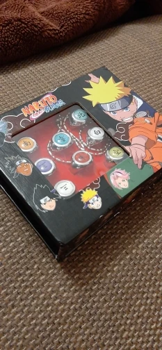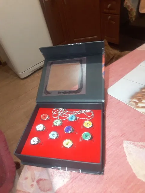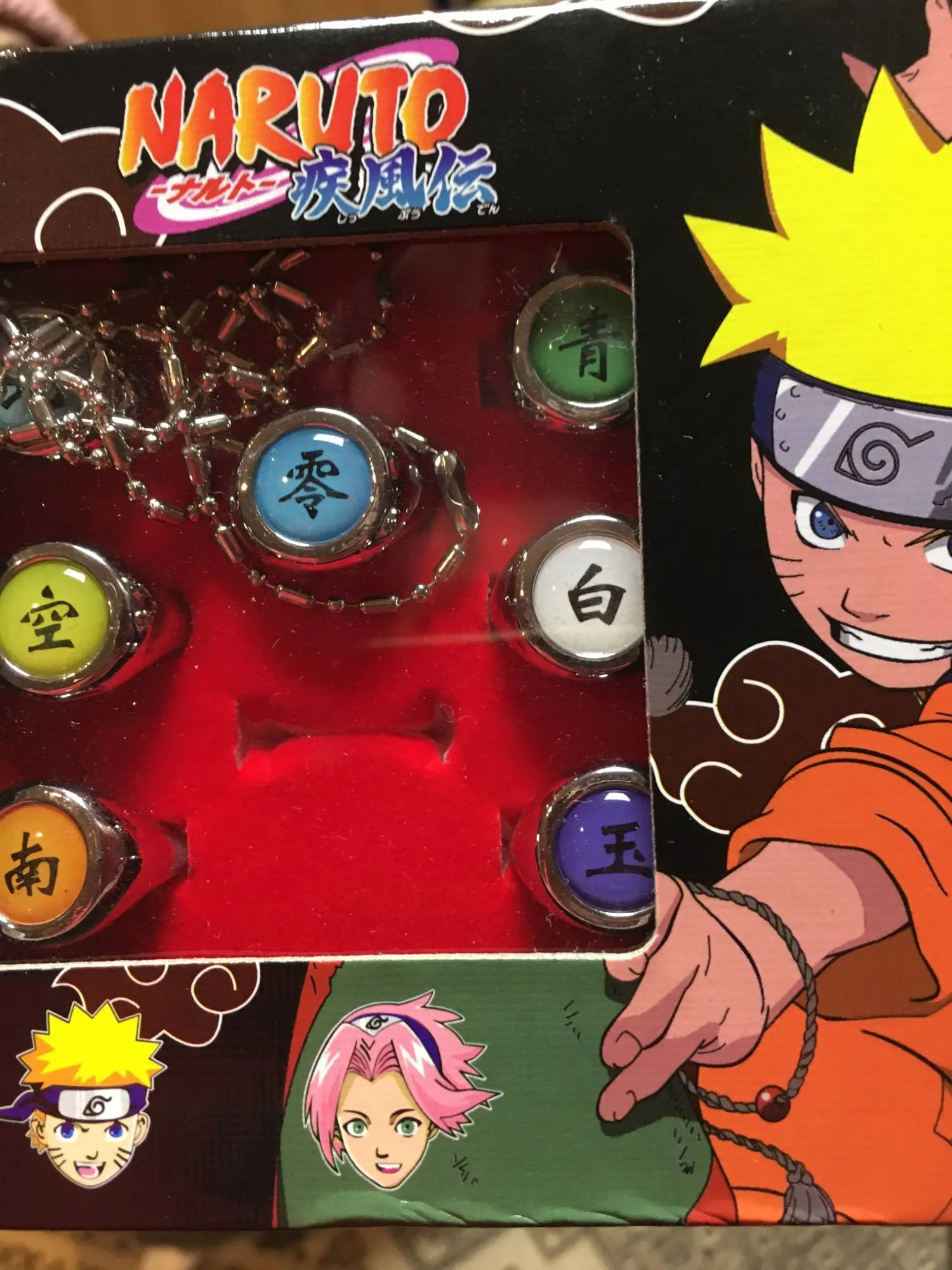 На коробке нарисован Наруто, но ни одного члена организации акацуки:)). Пришла с немного помятыми краями. Пластиковое окошко держится только с одного края. Сами кольца хорошего качества, с регулировкой толщины. В подарок к кольцам положили декоративную цепочку.