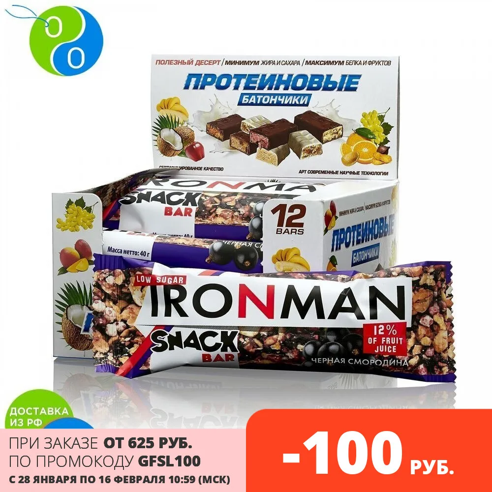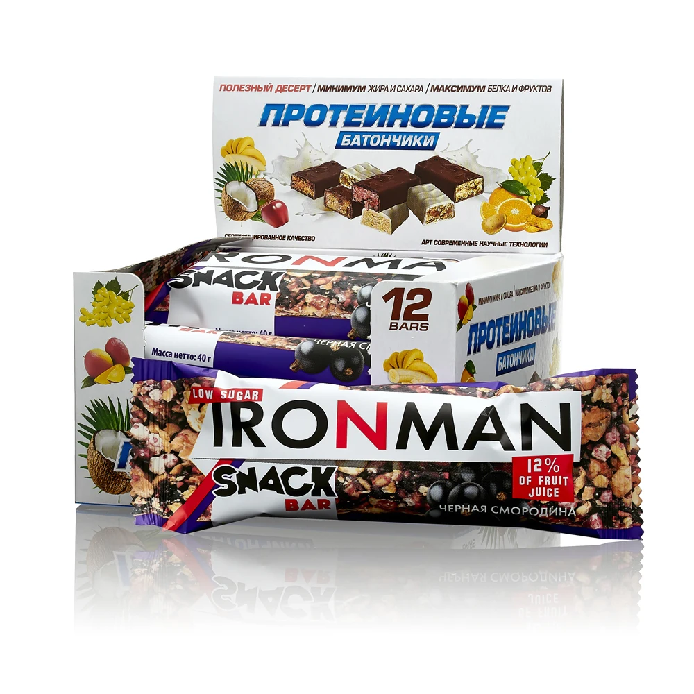 Россия "IRONMAN" Батончик (коробка 12 шт.) "SNACK BAR", 40 г (Черная смородина / тёмная глазурь без сахара)