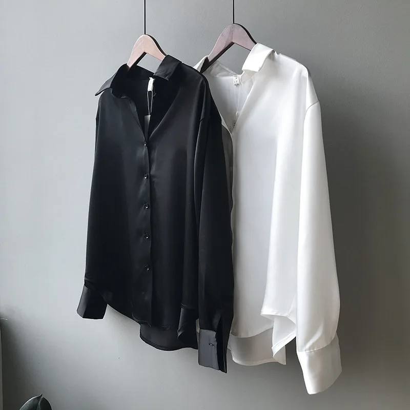 Однобортная женская рубашка с отложным воротником, свободная атласн...