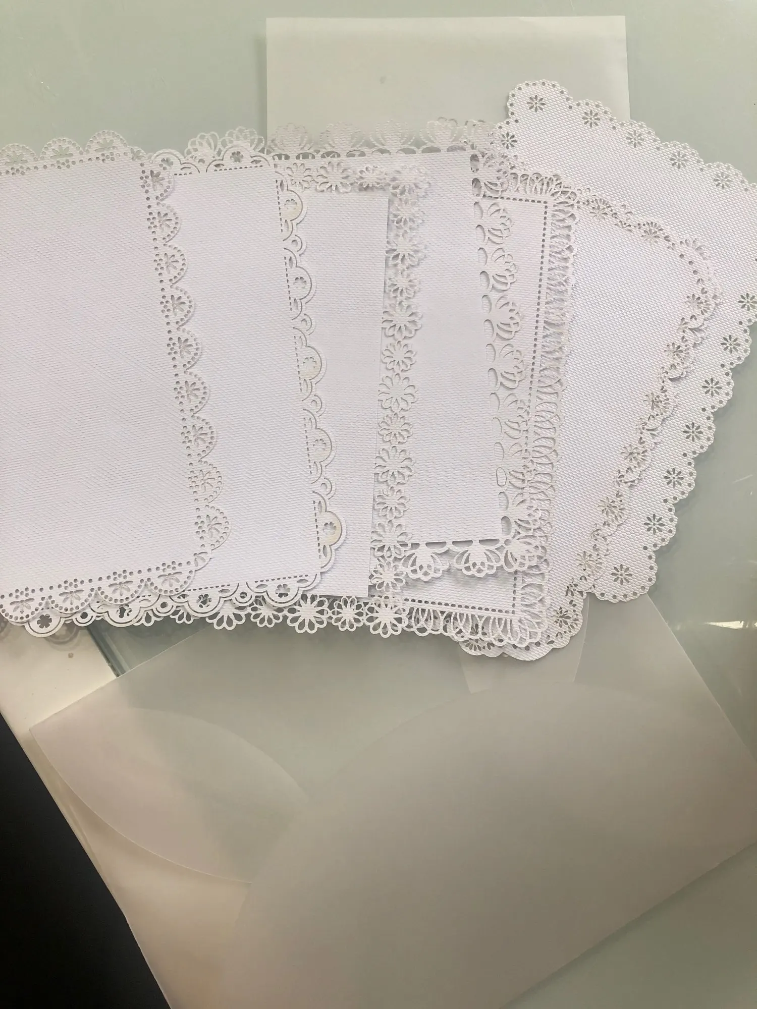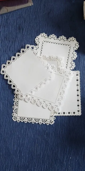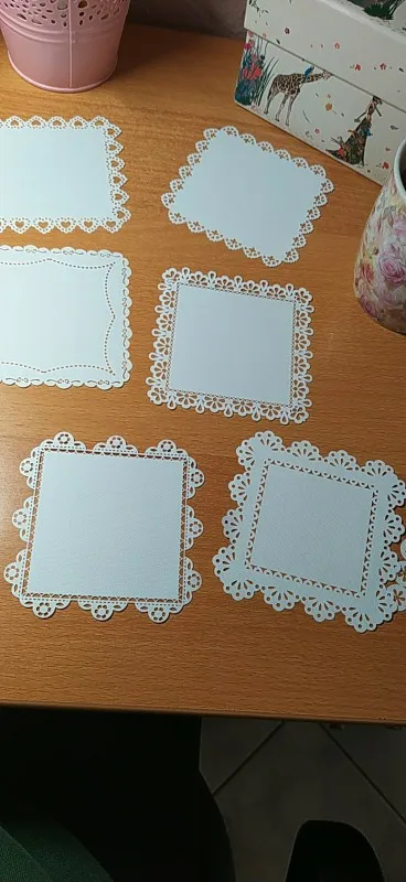 Хорошие подложки для фото. В упаковке 10 штук. Материал необычный что-то среднее между гофрированой бумагой и кармашками для фото из альбомов. Красивые, сделаны аккуратно, но очень легко мнутся. Жалко что нет выемок для фотографий. Дополню как попробую их в деле чтобы посмотреть как они клеятся.