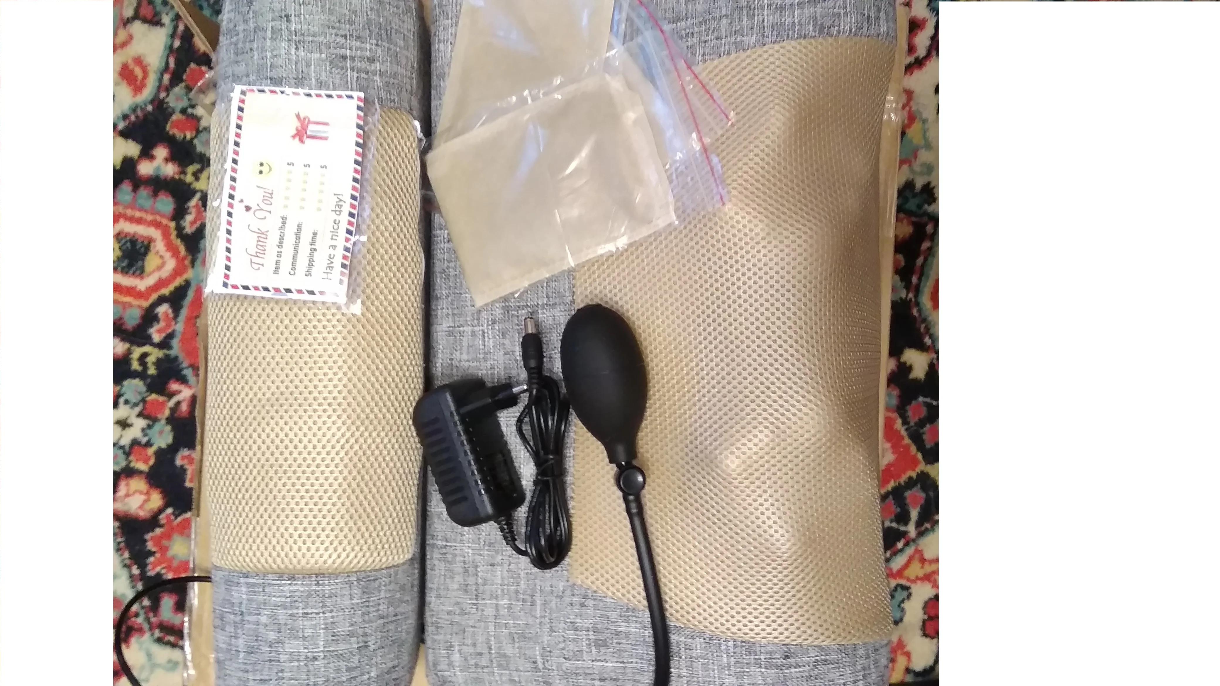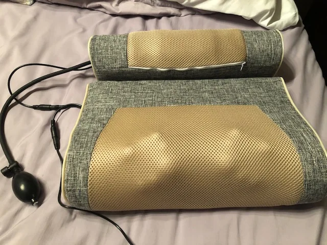 Доставка менее недели из РФ. Товар упакован в коробку. В комплекте массажер, адаптер к сети, инструкция на иностранном языке и три саше. Массажер состоит из двух частей, которые можно соединять между собой. Снаружи они соединяются с помощью молнии и также есть соединение проводов. Отсюда следует, что каждая часть может работать самостоятельно, либо обе в паре. Меньшая подушка предназначена для прогревания. Она имеет кармашек, в который можно поместить саше с травой (в комплекте их три штуки). Сбоку есть груша, благодаря которой можно подкачать высоту до нужного уровня, спустить воздух легко, одним нажатием. Нагревается очень быстро, осуществляет качественный прогрев.