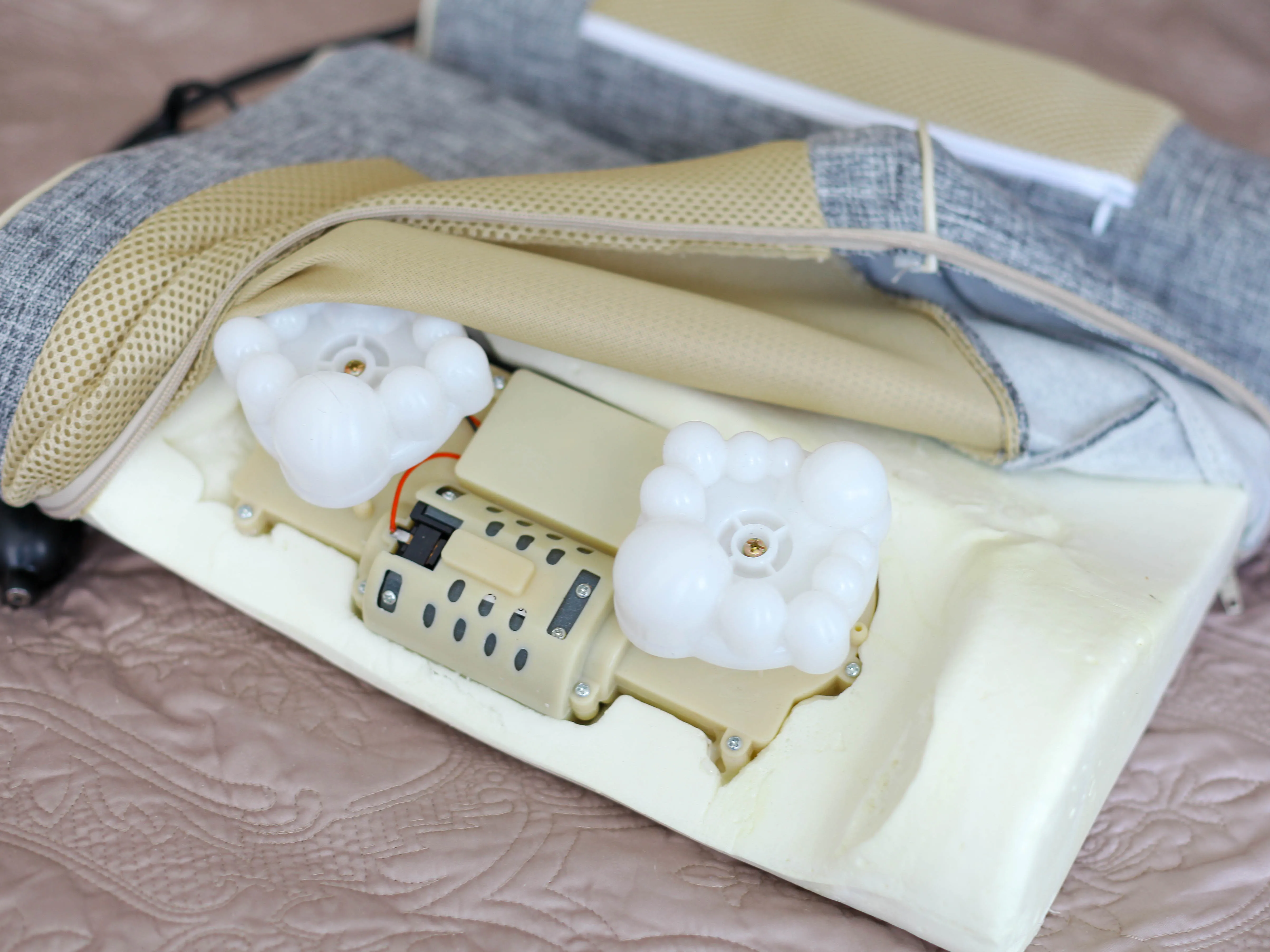 Удобная подушка. Но инструкции никакой - как ее укладывать, какие режимы она имеет и так далее. Половина кнопок пока непонятна )) есть один минус - движущиеся "пальцы" надо немного полирнуть наждачкой микронкой, чтобы они не царапали ткань, а то можно и порвать ее. У кого слышится под нагрузкой треск ткани - полируйте )) Нагрузку, конечно большую на данный массажер возлагать нельзя, но для размятия поясницы или шеи вполне подходит.