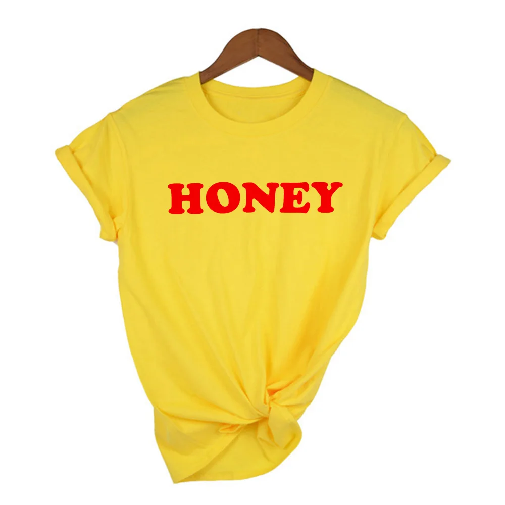 Женская летняя футболка с надписью Honey, желтая футболка с коротким рукавом и круглым вырезом, топы для женщин 2020