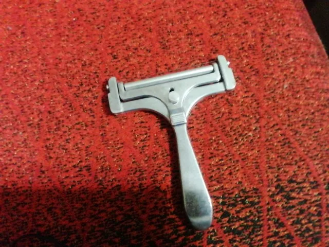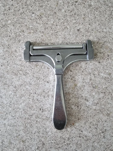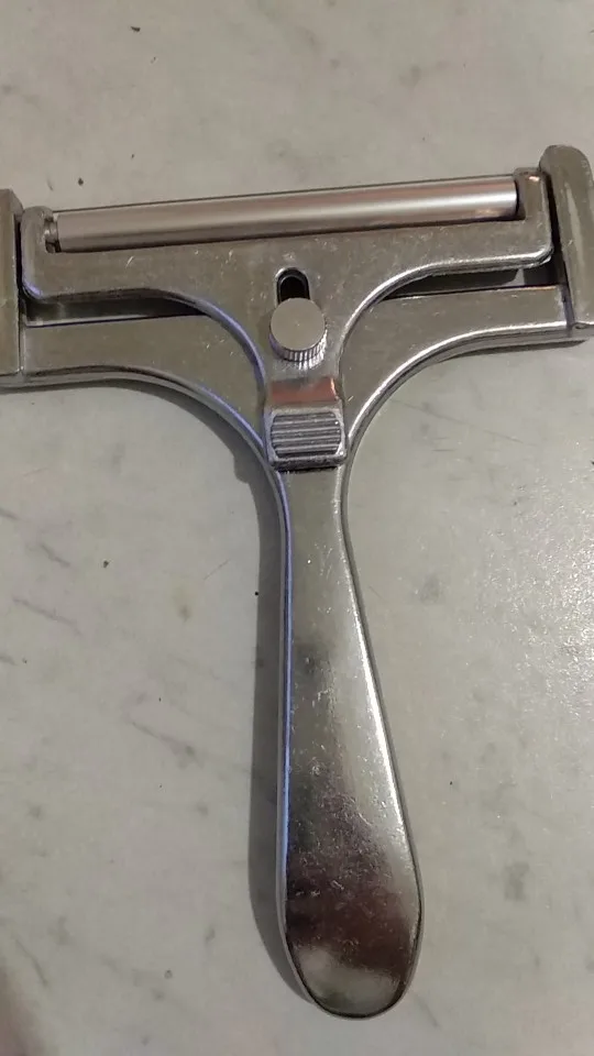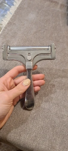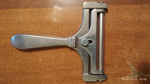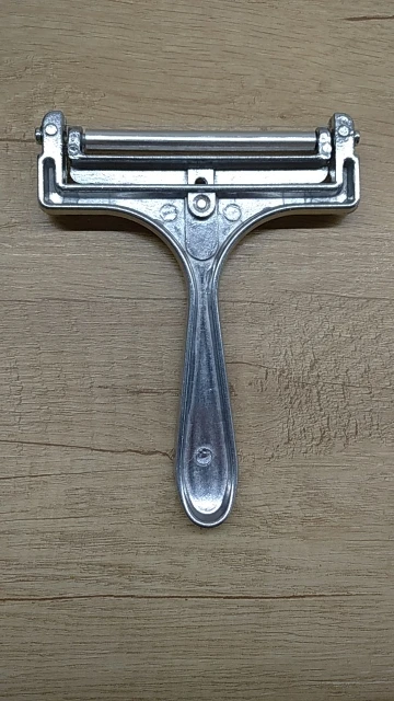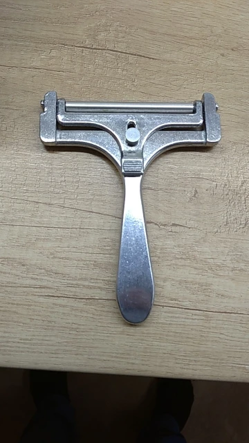 Вполне годный товар. Можно регулировать толщину. Для полутвёрдых сортов сыра. Но надо приноровиться ей пользоваться. Я держу практически вертикально по отношению к куску сыра. Материал силумин.